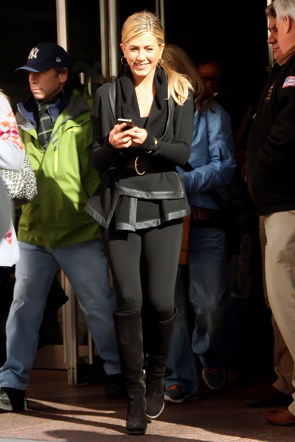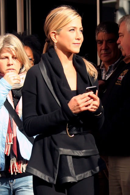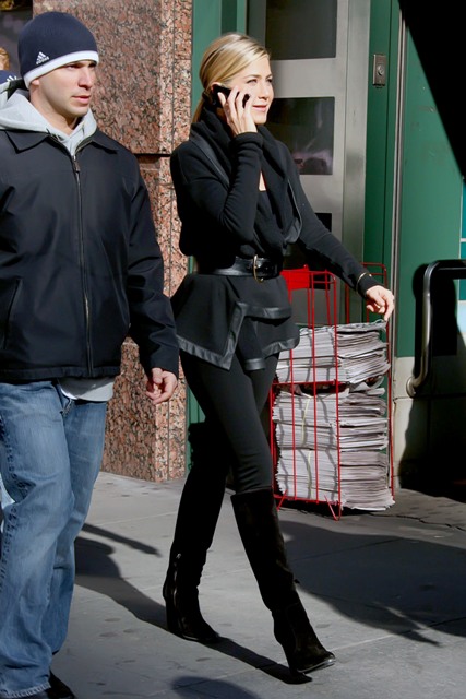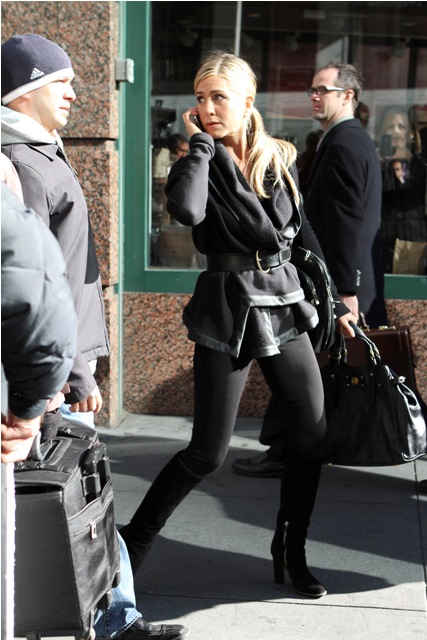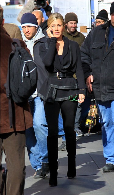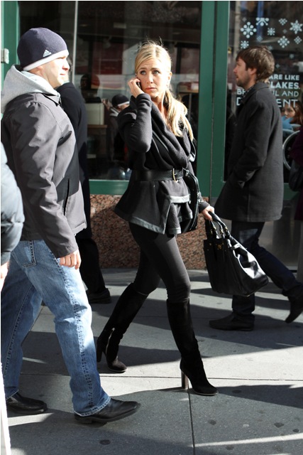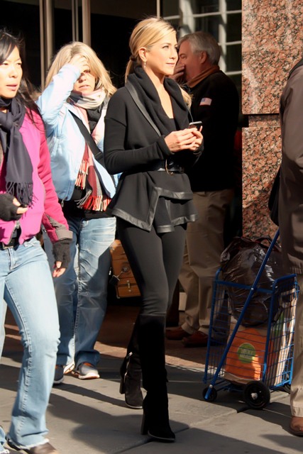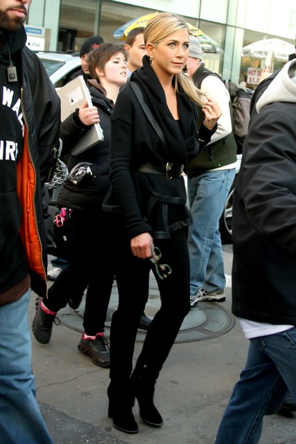 Here’s Jennifer Aniston in New York today shooting scenes for Wanderlust. That coat is a f-cking dream. And she looks amazing in those pants. I would have preferred flat boots but you know, a heel will always make you look thinner. And, well, that’s most of Jennifer Aniston’s goal in life.