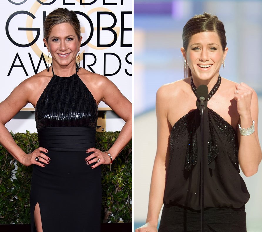 If she did want to be noticed, couldn’t she have come up with something new? You remember what Jen wore to the Globes in 2003? Also with her hair up? Here’s the side-by-side: