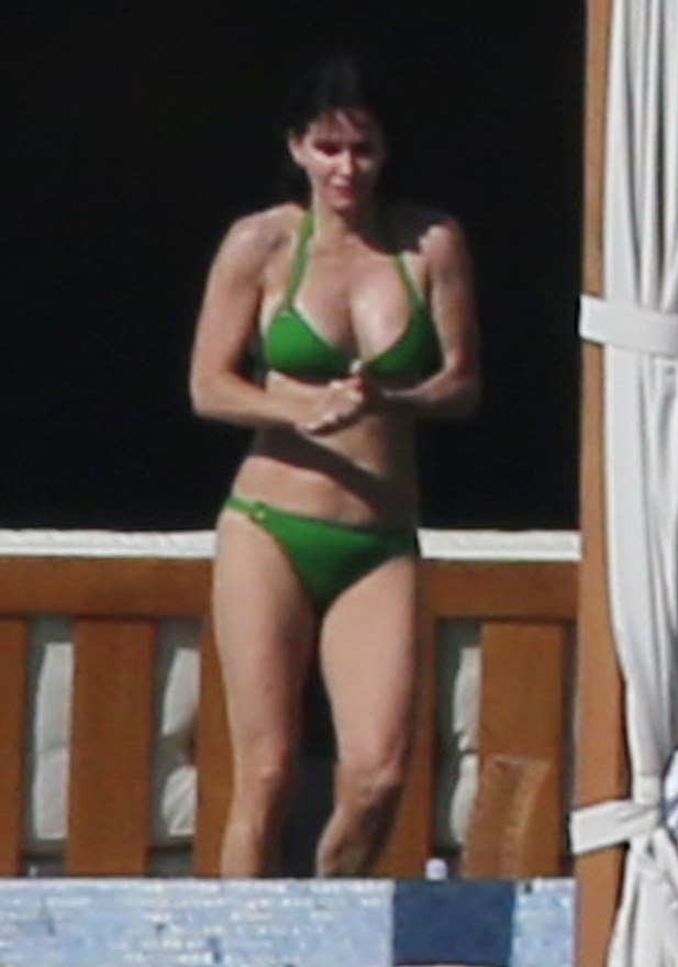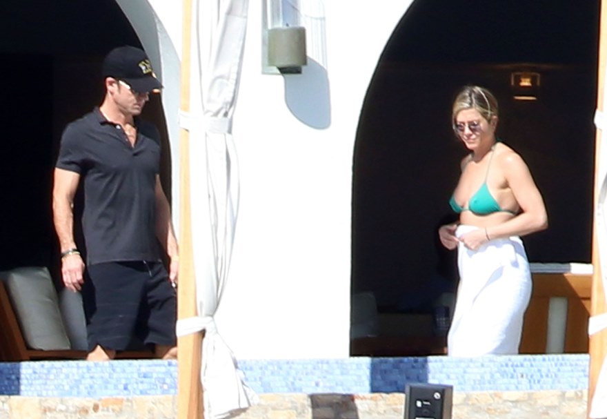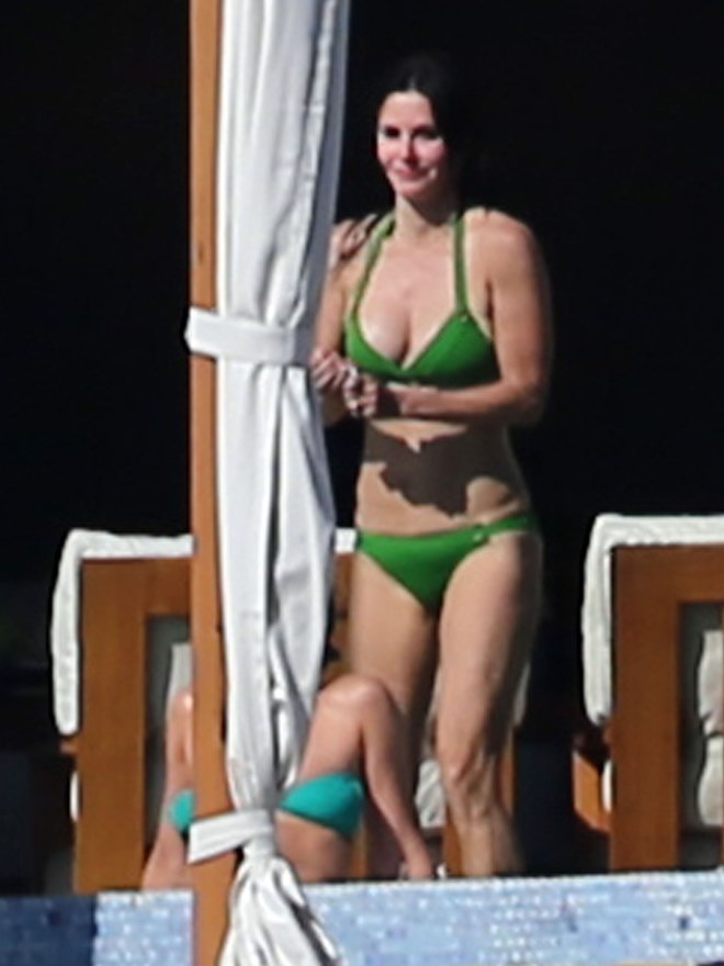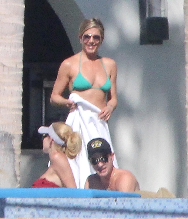 Jennifer Aniston and Courteney Cox are approaching 2014 in Cabo. Yesterday they both wore green bikinis. Jen hydrated with SmartWater. She wrapped her arms around her still-fiance at one point. Perhaps she was congratulating him on finding another pair of shorts.
