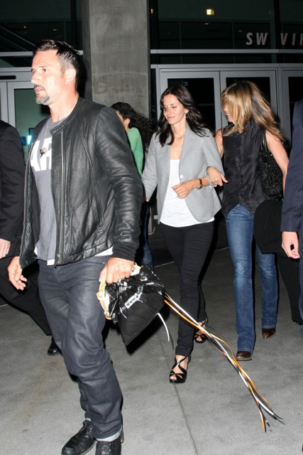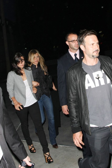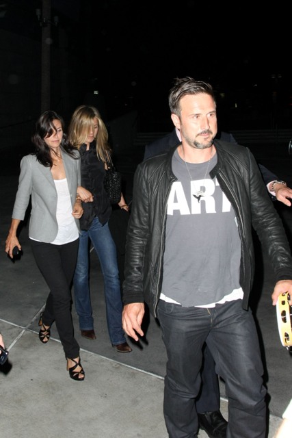 After shooting in New York for several weeks away from her bestie and her favourite shoulder to cry on, Jennifer Aniston was back in LA last night with Courteney Cox and husband David Arquette for the Fleetwood Mac show.