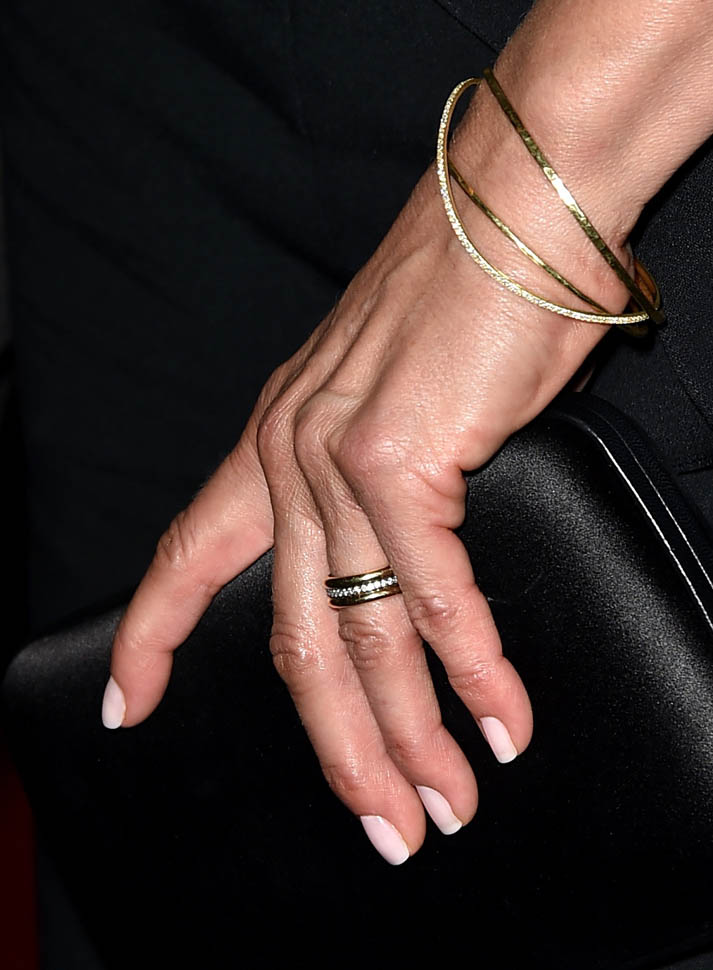 Jennifer Aniston made her first post-wedding appearance last night at the premiere of She’s Funny That Way. I’ve attached shots of her wedding band below. The wedding dress remains a mystery. Earlier this week people were freaking out about it being this: