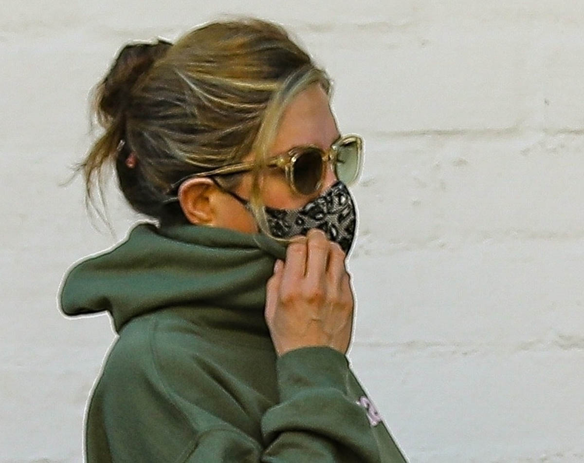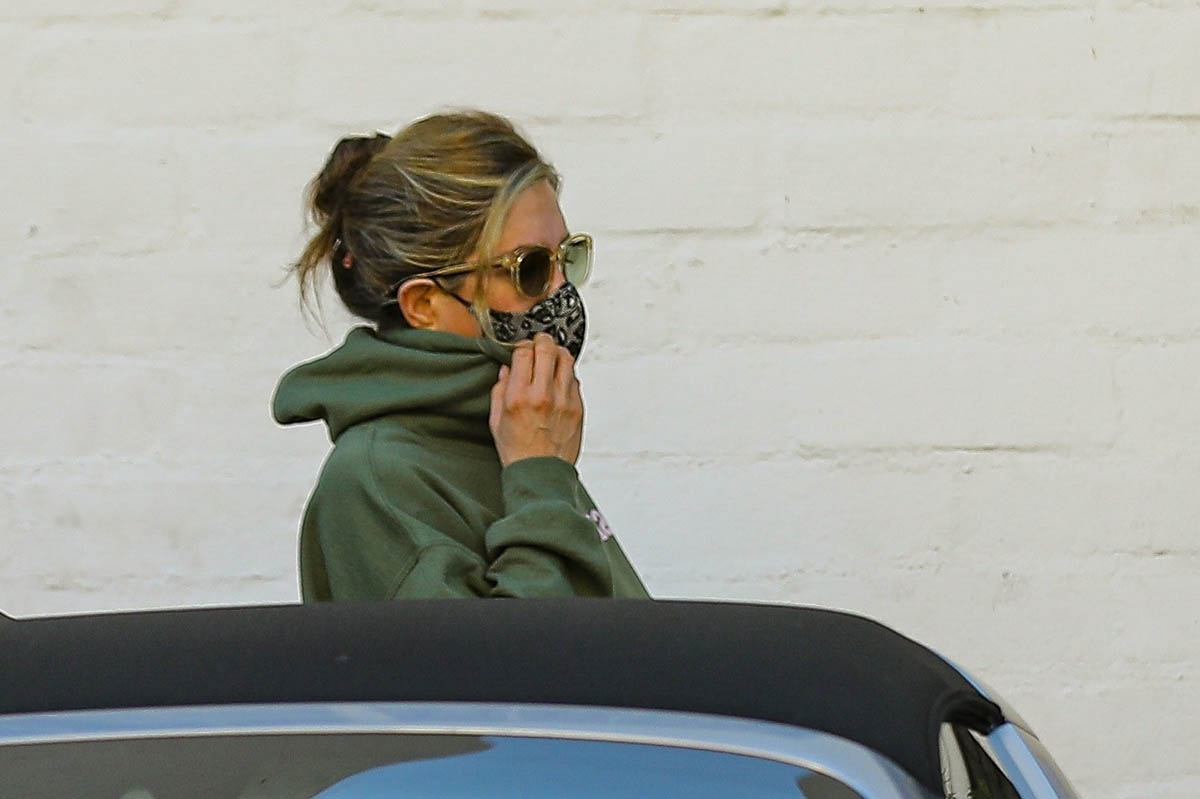 Earlier in the day, Jen was photographed after leaving a skincare clinic in Beverly Hills. I really like these sunglasses on her but that’s probably vanity talking because my go-to sunglasses are similar, only hers seem to be slightly gold-tinted and mine are more of a stone finish, and probably way cheaper. I also really like the look of Jennifer Aniston in a hoodie. We don’t see this often, do we? I have many Jennifer Aniston outfits on recall and none of them involve a hoodie.