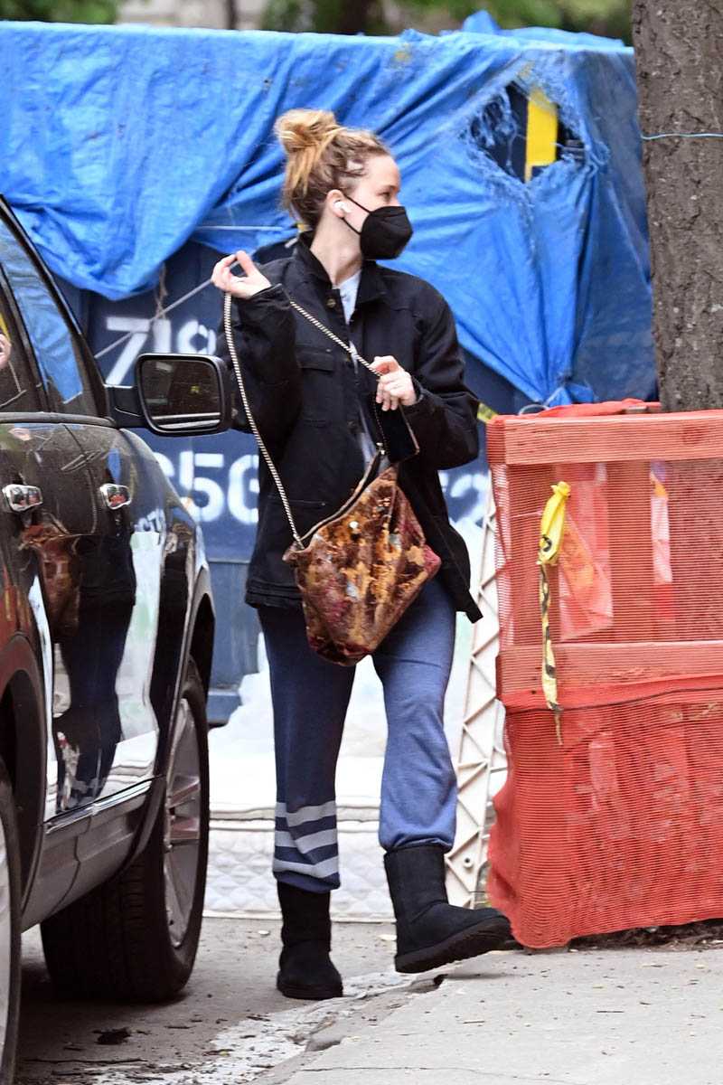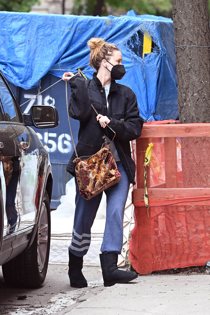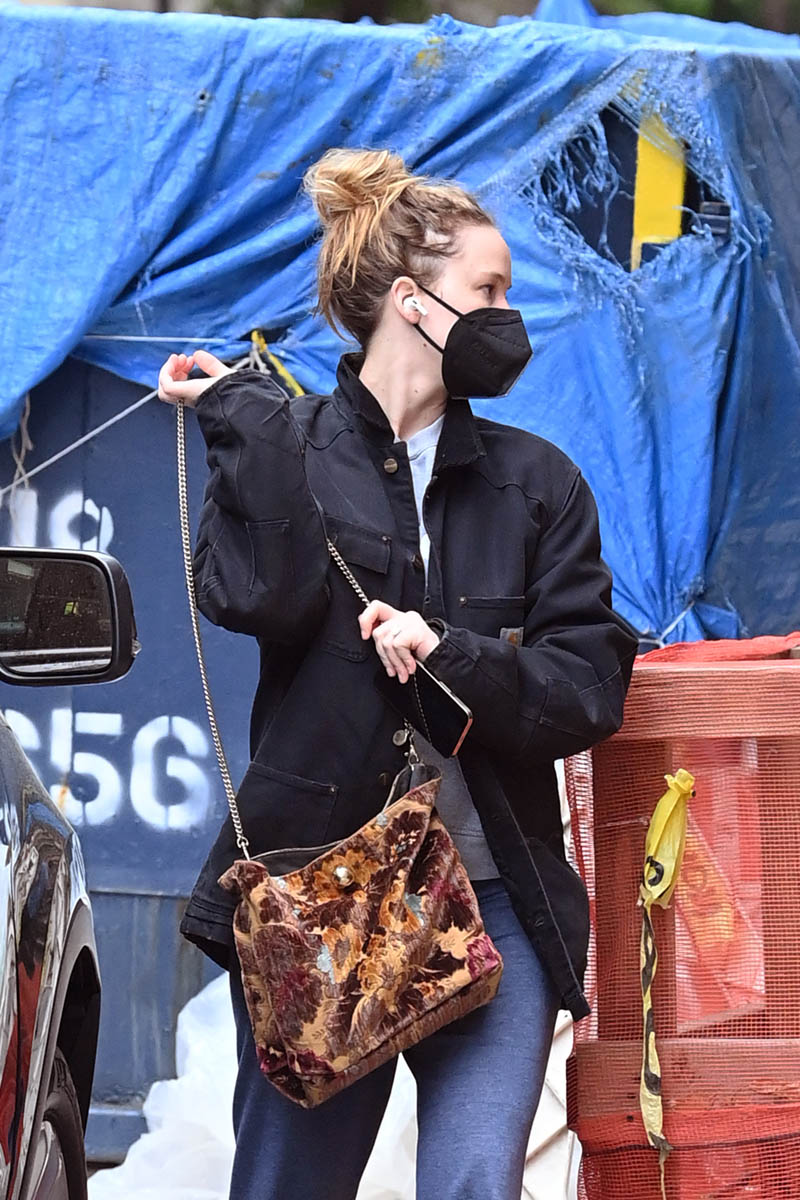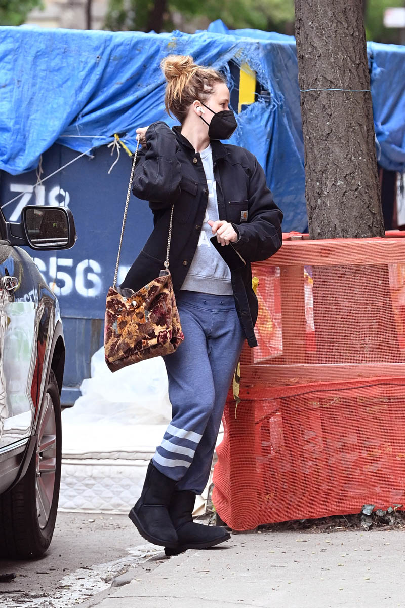 Over in New York, Jennifer Lawrence was also photographed running errands, casually dressed in sweats. That’s an…interesting bag, I’m curious to know what the texture is. She’s carrying it here with what looks like a Carhartt jacket which seems like it wasn’t a choice so much as a, whatever, let me just grab anything moment when she was leaving the house.
