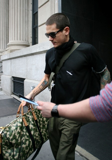 Photo attached of John leaving his NYC apartment with a travel bag.