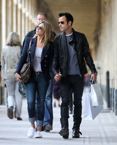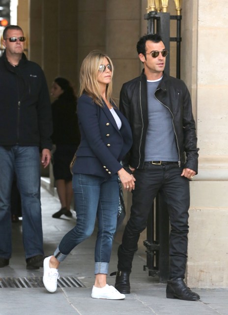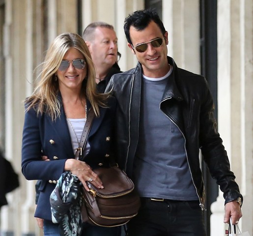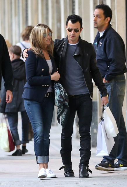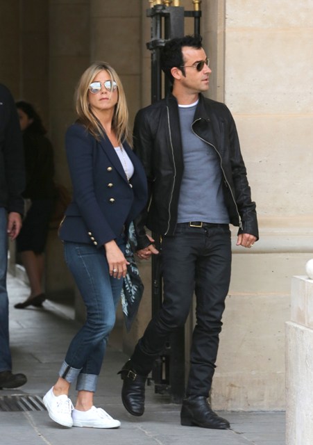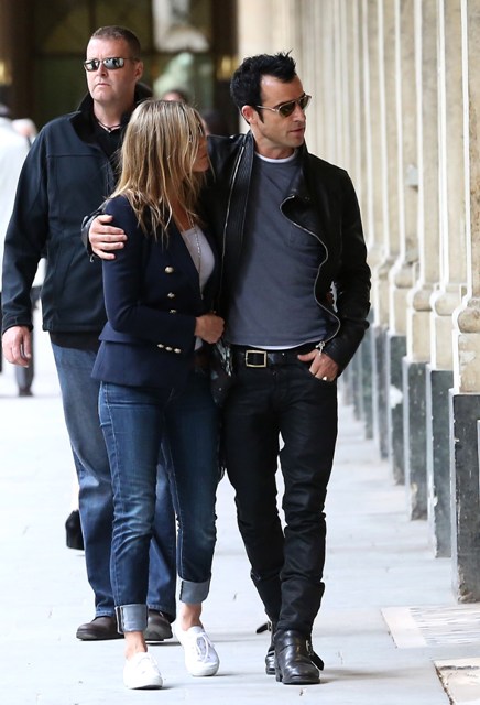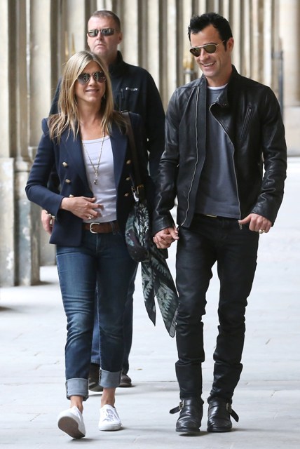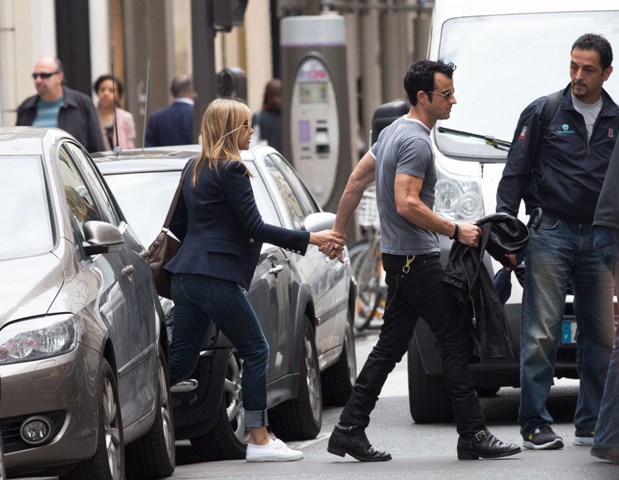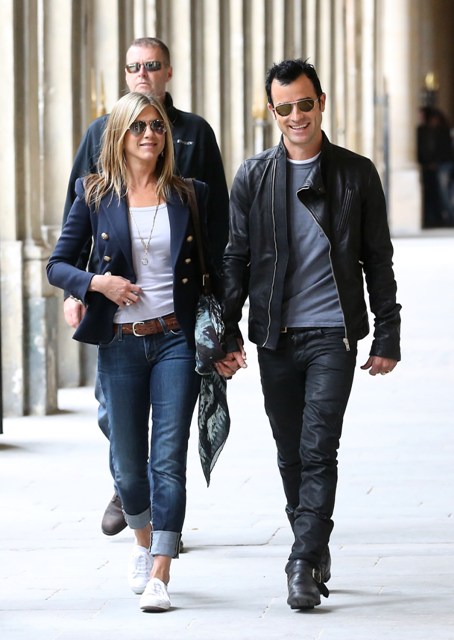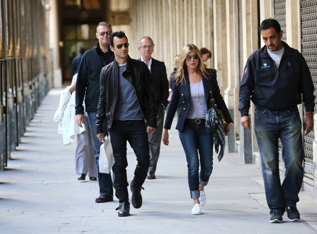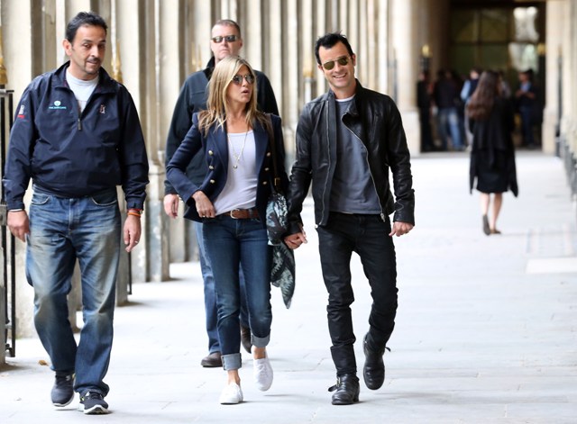Jennifer Aniston and Justin Theroux are now in Paris, photographed sightseeing together today. Looks like a happy start to their holiday. Looks like it took a while for her security to clue in and get out of the shot. That must be so weird. I guess it’s been long enough for her by now but...do you ever get used to it?