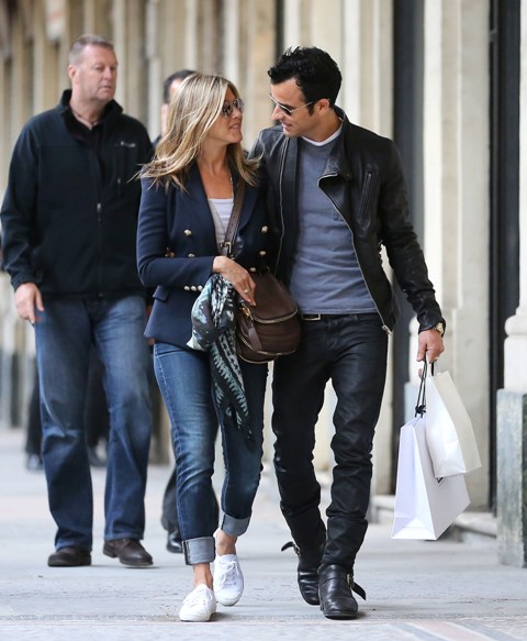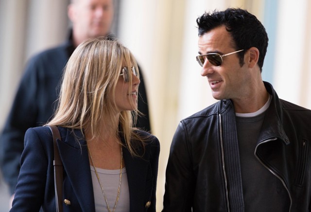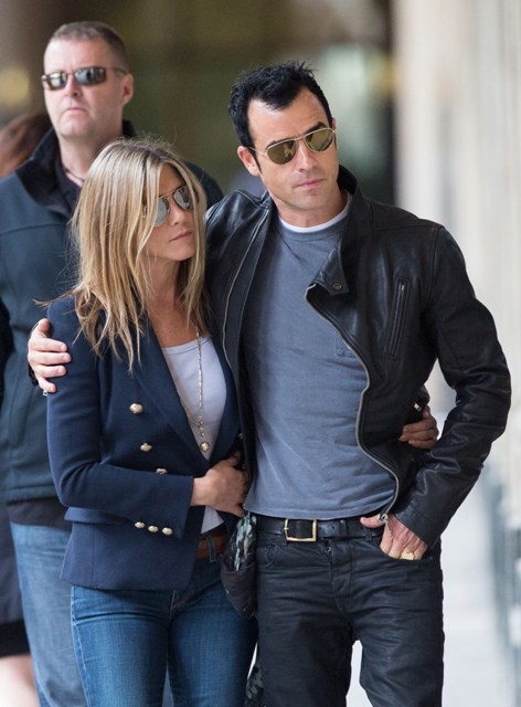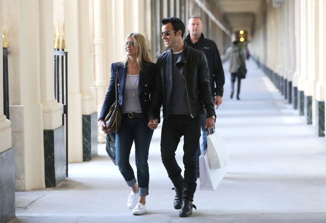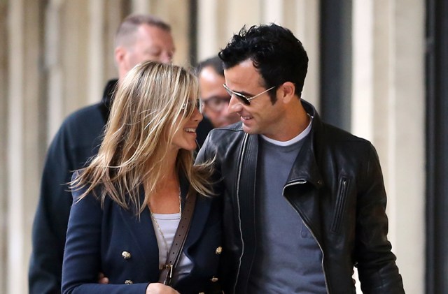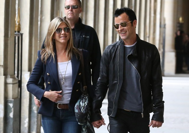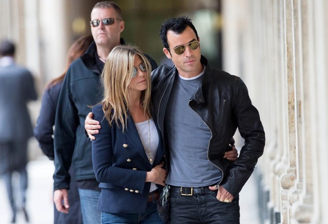 In Cannes a couple of weeks ago, Robert Pattinson’s bodyguards blocked the bathroom for him when he went to take a leak at a party. I don’t know if I could pee under those conditions. I’d feel too rushed. And I already have problems getting out a strong stream in the privacy of my own apartment. Such is life for the former wife of Brad Pitt. Vince Vaughn had a problem adjusting to it. Justin Theroux doesn’t seem like he minds...at all.