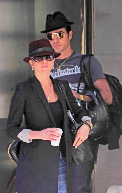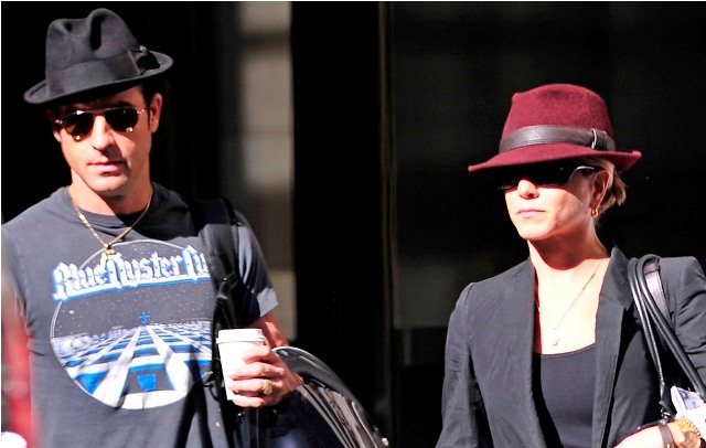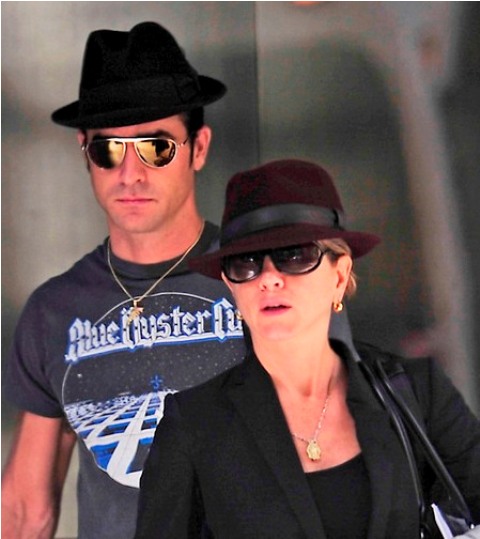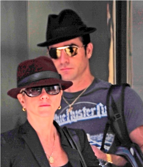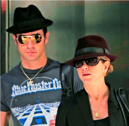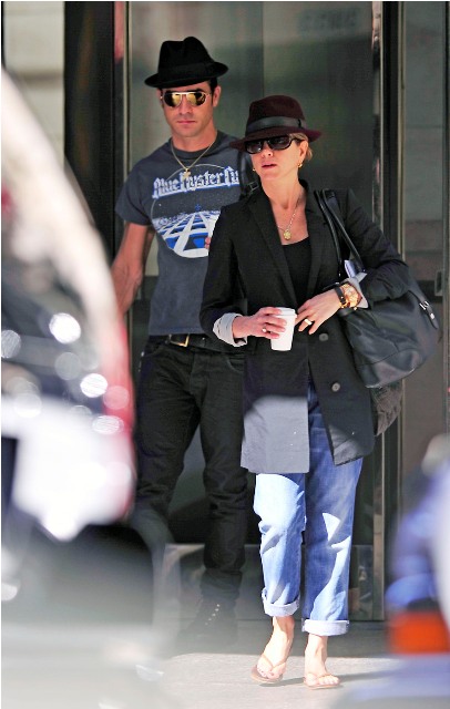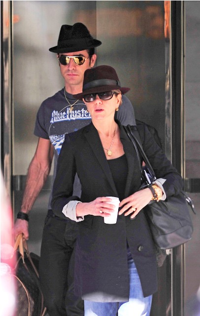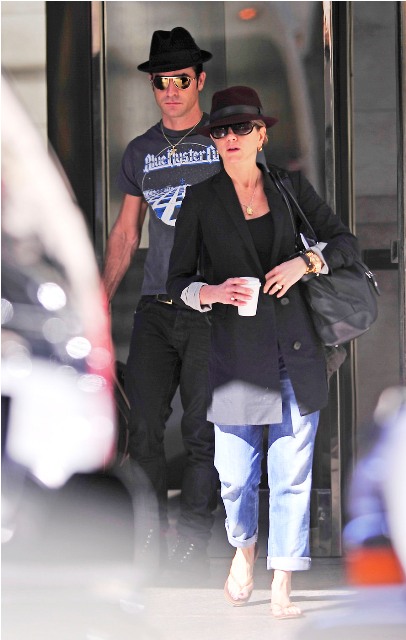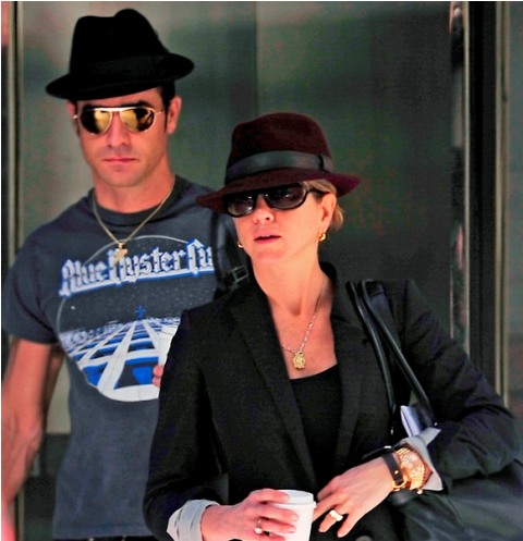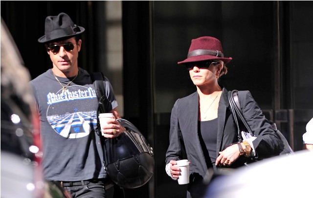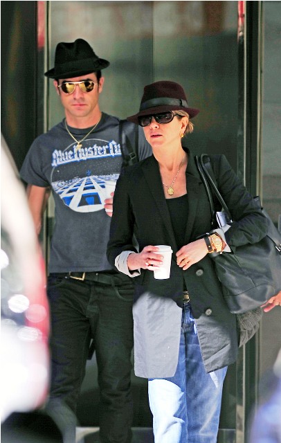 Here are Jennifer Aniston and Justin Theroux leaving their NY apartment the other day, both wearing fedoras. I can't even imagine how stressed out Lorella is right now looking at these photos. She's probably making her nails bleed right now, trembling under her desk.