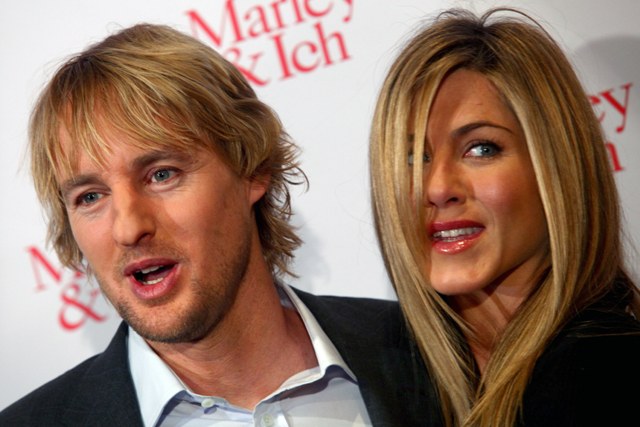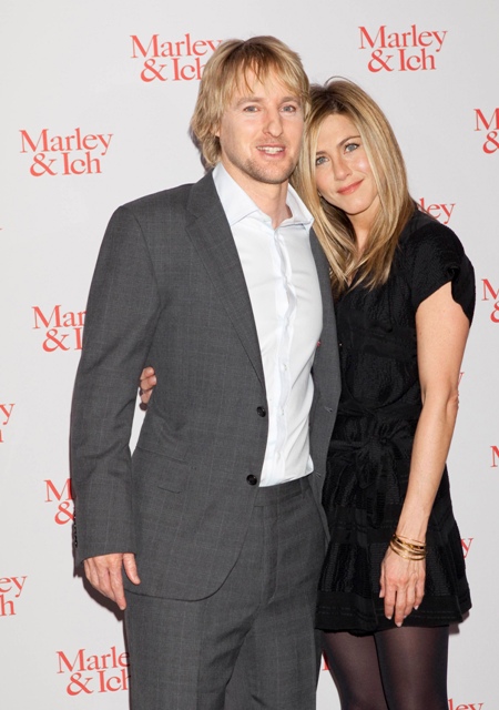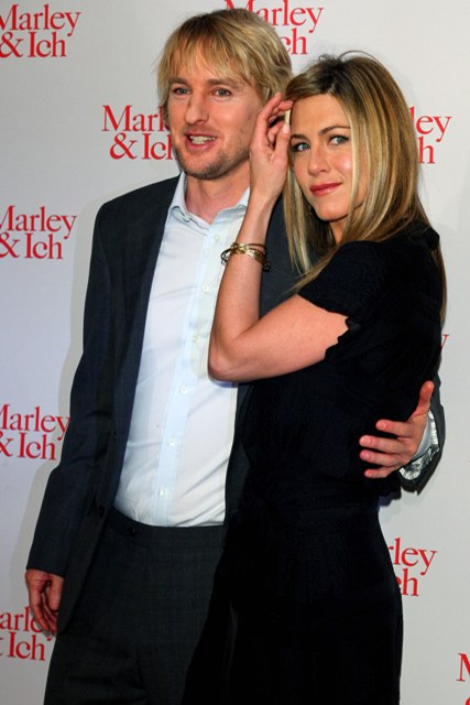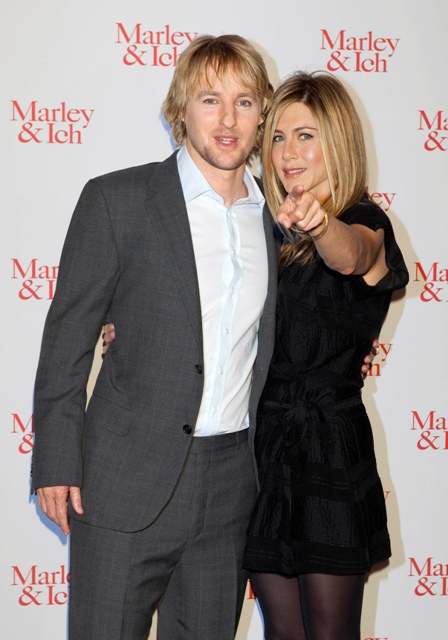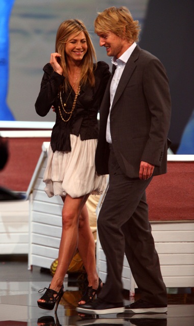 After appearances promoting Marley in Paris and Rome, Jennifer Aniston and Owen Wilson were in Germany on Saturday, first at a photo call and then on the show Wetten Dass where Jen showed off those fabulous at 40!!!!! legs in a short white pouffy skirt under a well cut jacket teetering on a pair of hot heels. Sassy heels. Great sassy heels.