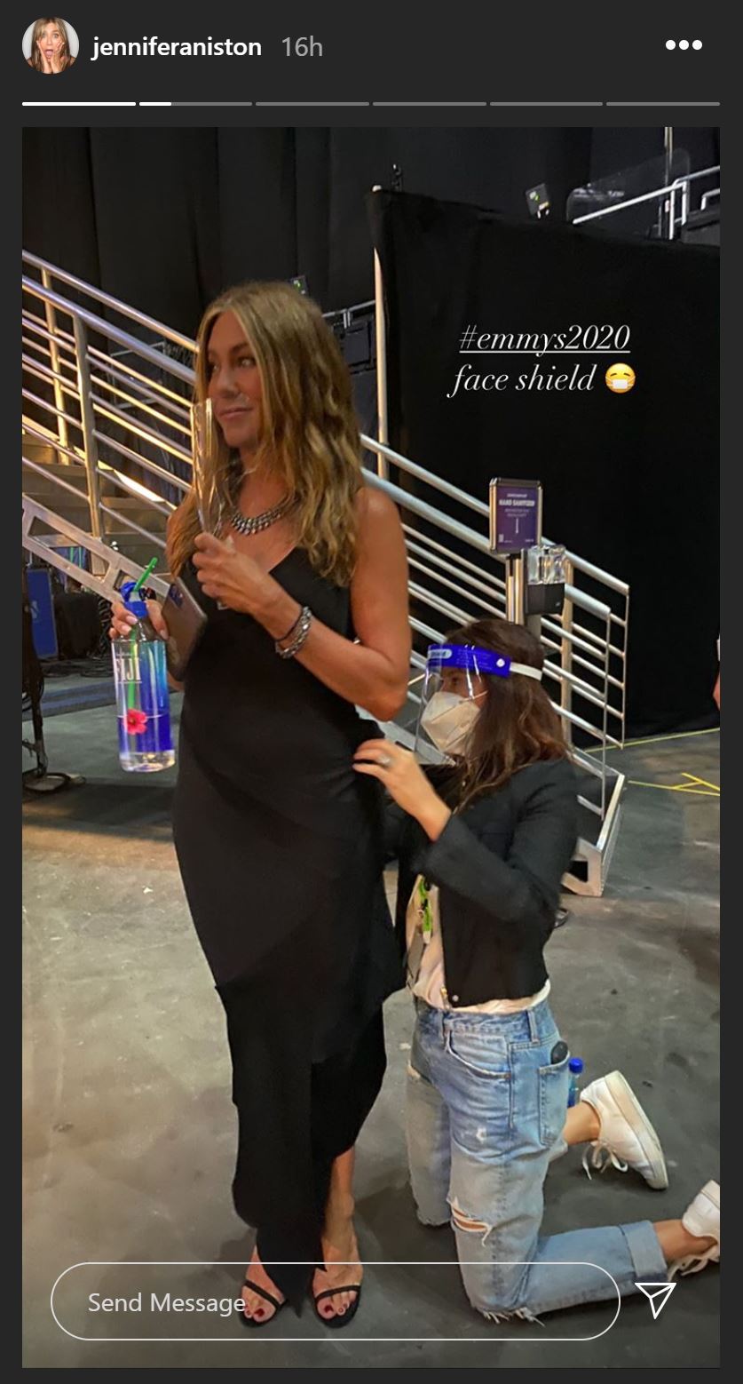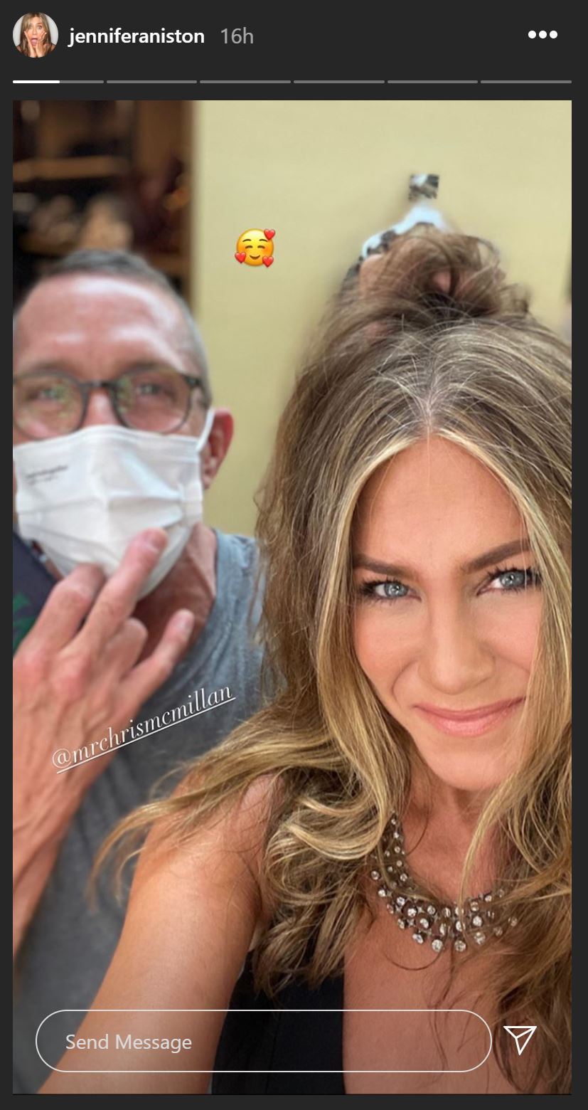 But I know most of you are here for Aniston. Here she is getting ready with longtime hairstylist Chris Mcmillan, and prepping for the Great Fire Stunt onstage. If you didn’t see the face shield, couldn’t you squint and pretend it was 2010?