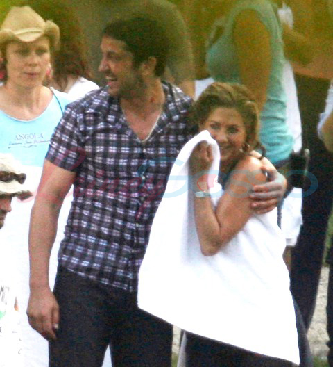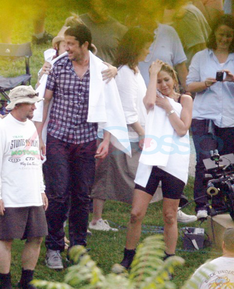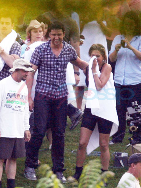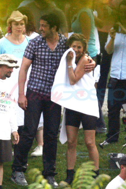 So happy to be papped on a film set – Jennifer Aniston and Gerard Butler continue to shoot The Bounty in New York in a scene that involves Jen getting wet and of course photographers were around as he hugged her while she toweled off.