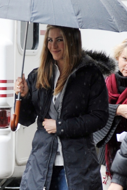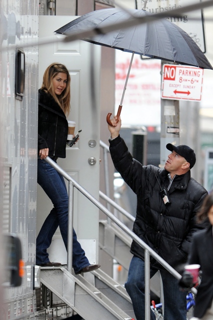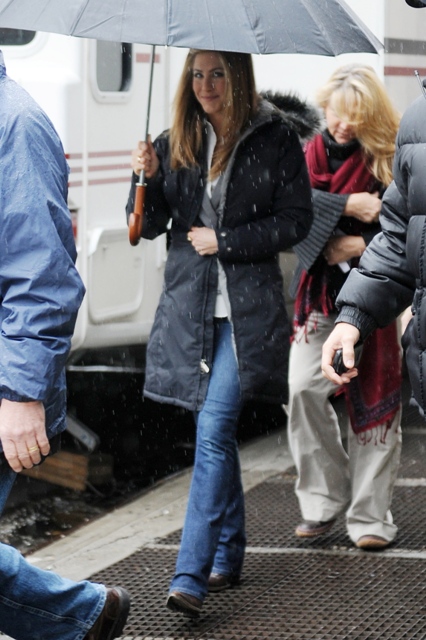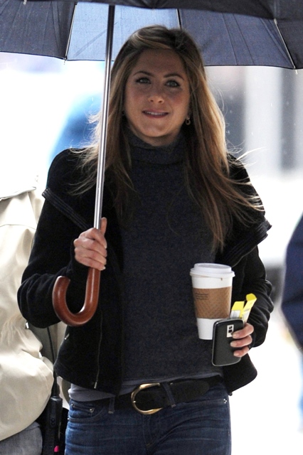 This is Jen on the rainy NY set of The Baster today holding her own umbrella, great eye makeup, even better body, clutching her blackberry heading to shoot. Looks like a blackberry bold. My husband uses a bold. I use a curve while Duana, after almost 2 years, is still in love with her iPhone. I’d love an iPhone. But I don’t love the touch pad. I find it a bitch to text. And I mad text/email/post to my blog from my blackberry. And it’s a pain in the ass to crank out over 100 words on that screen…