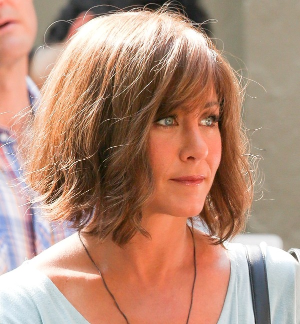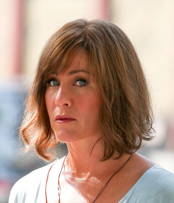 This is apparently what Jennifer Aniston's hair in Squirrels For The Nuts will look like. This is apparently what "therapist" hair looks like? She plays one in the film. Here's Jen heading to set today wearing her big engagement ring. These shots provide a really good illustration of what a difference good hair makes. Real Jen, famously, has great hair. Character Jen does not have great hair. What's the effect?