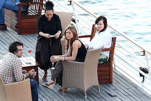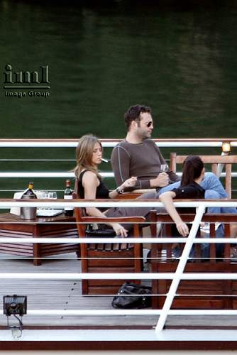 So it’s either good news or bad news. The good news would be that Jen and Vince are pregnant, that the little bulge inside Jen’s little belly is actually the beginning of their Shiloh counterattack – a delusional attempt to usurp the Olympian superiority of Hollywood’s ultimate golden child. For her sake, I hope that’s the case. Because if she isn’t carrying and if there really is nothing going on in there, the town’s most notorious starvation sister is going to be sucking lemon for the next 3 weeks to get rid of the teensy tiny amount of bloat/weight/normal healthiness that seems to have taken residence around her midsection. And while I don’t know for sure, I really don’t think she’s pregnant. Which means the poor thing must have drowned herself in carbohydrates following the Arrival of the Chosen One. But nothing a little bout of anorexia won’t cure, right? Oh and don"t forget the ciggies - always a great appetite suppressant. In her defence, as a smoker, you can"t not smoke in Paris. And definitely not along the Seine. These were taken on Saturday. Thanks to Shann for the pics.