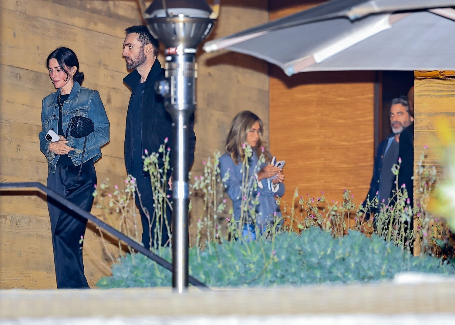We now have our first good quality shot of Jen and Jim together on yet another double last night at Nobu in Malibu – but still not on their own. This time it was with Courteney Cox and her longtime partner Johnny McDaid. And both couples are in couples outfits!