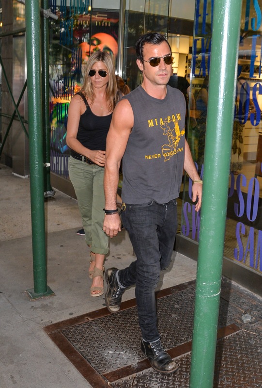 Jennifer Aniston and Justin Theroux stepped out in New York this weekend. They went to see Grown Ups 2. Um, really? Sure, as you know, Jen is tight with Adam Sandler. So how does it work when your friend is in a movie that really, really sucks? Do they laugh? Does Justin Theroux, in his muscle tee and tight jeans, a proper writer who hangs with a so-called New York arty crowd, does Justin Theroux laugh at an Adam Sandler joke?
