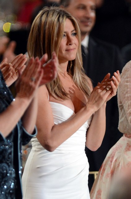 Here’s Jen last night at the Shirley MacLaine AFI tribute. I hate this white dress. I would hate it in black too. Makes her look old and not very imaginative. Think Catherine Zeta-Jones. Or Heather Graham.