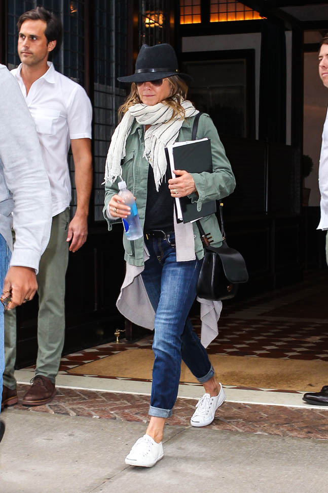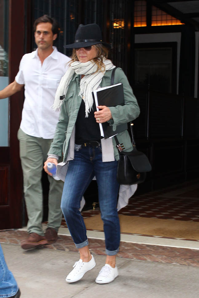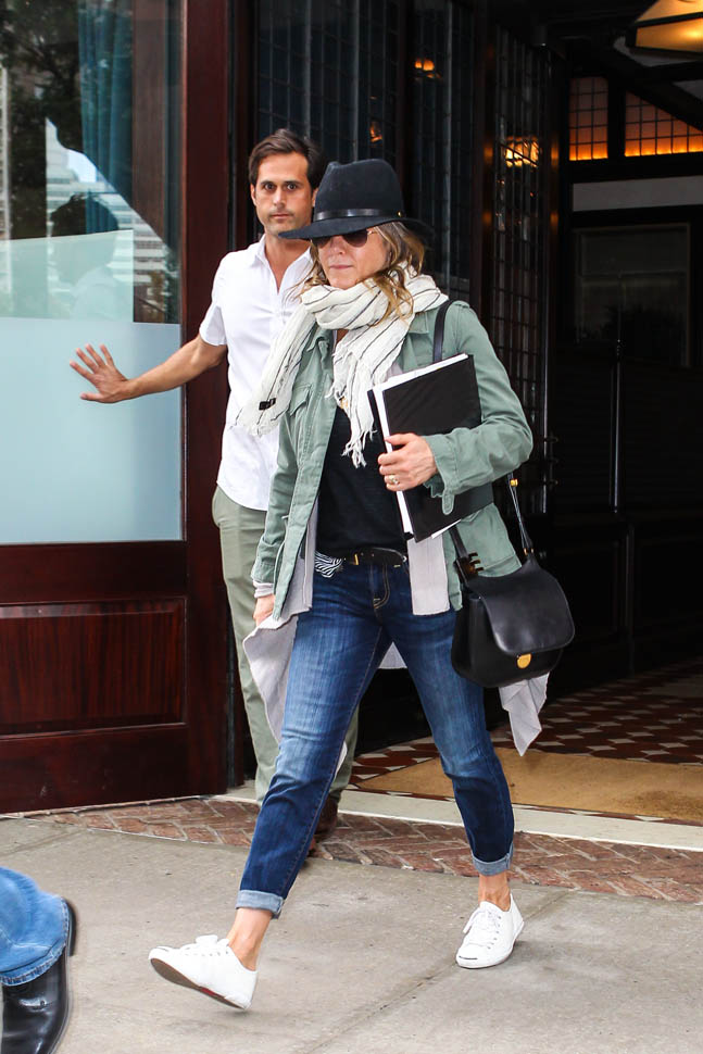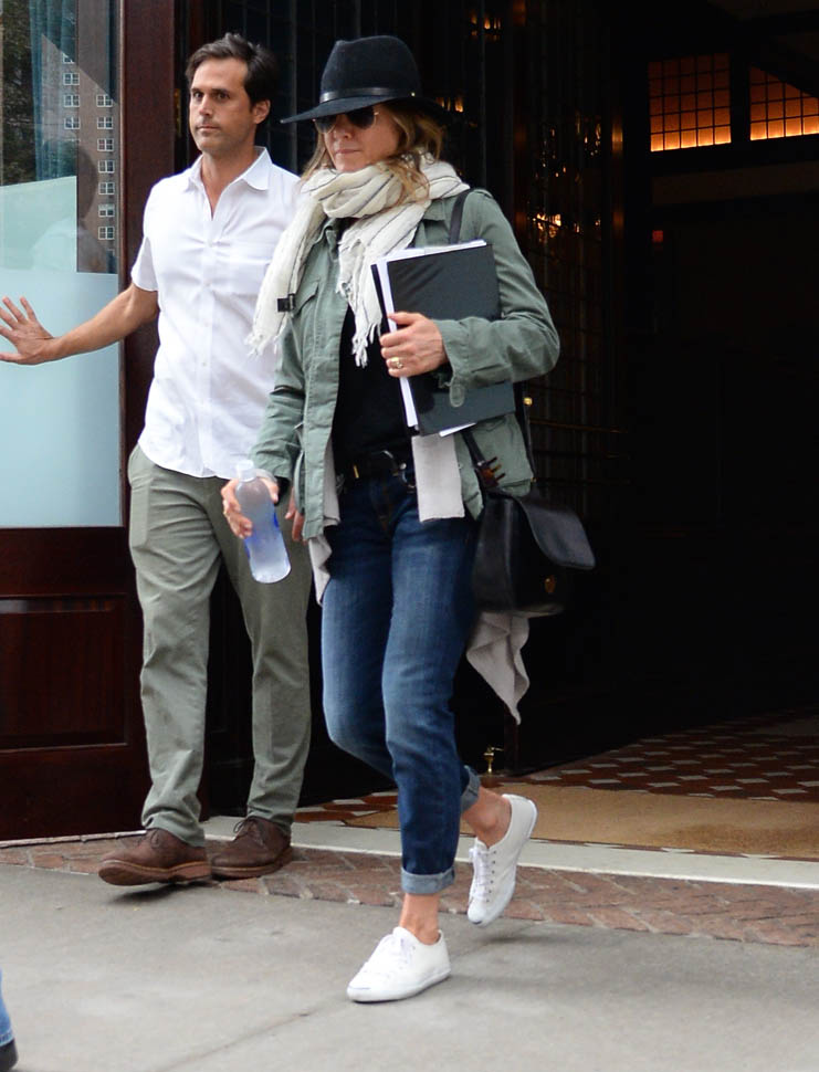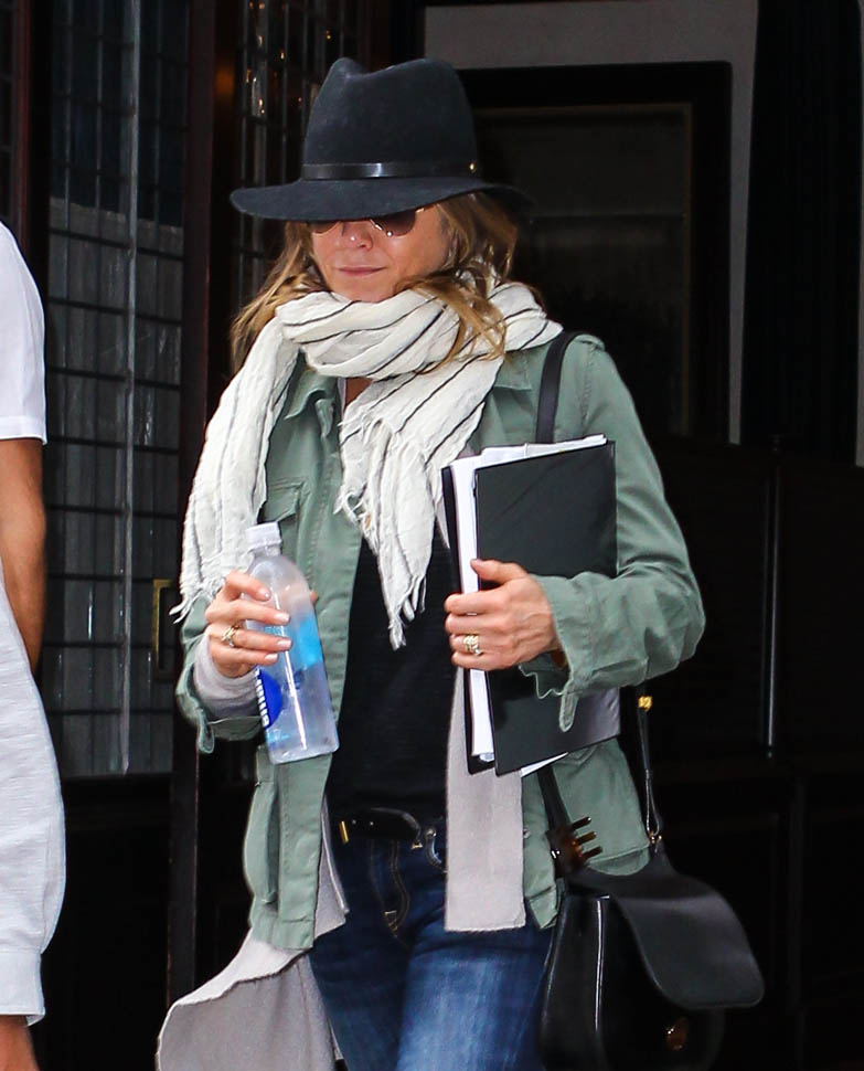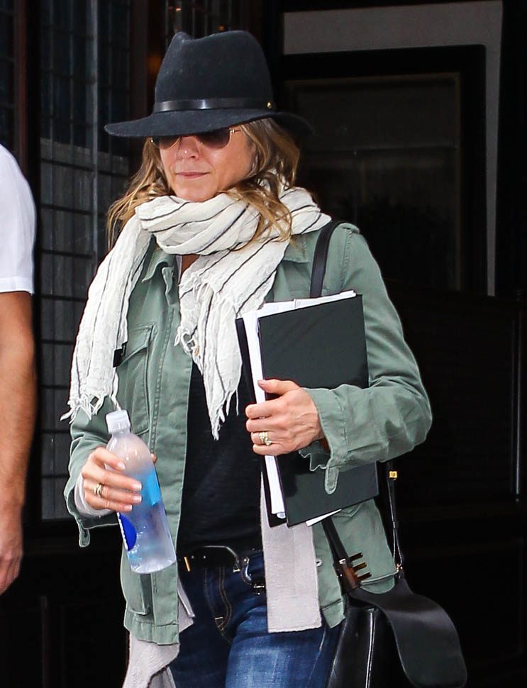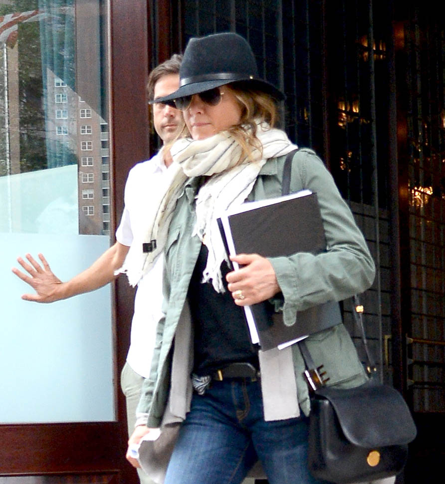 Jennifer Aniston has been in New York the last week or so. She was photographed leaving her hotel today holding on to what looks like a script. As I mentioned the other day – click here for a refresher – Jen’s just confirmed several non-rom-commy roles. It’s serious acting time. And that puts her endorsement deals in perspective too. It’s the George Clooney model. George takes the coffee and car money so that he can avoid the Batman paycheques. Perhaps this is what Jen is doing with her airline and beverage cash. Always the smartwater.
