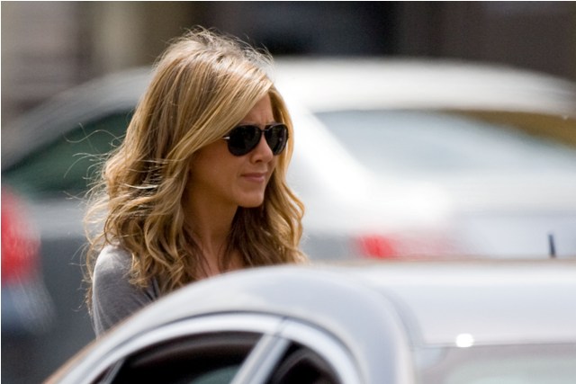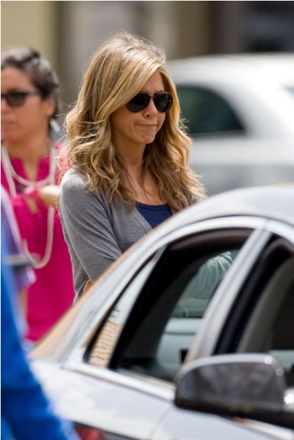 Jennifer Aniston hikes up her jeans today on the set of Just Go With It with Adam Sandler. A really great ass. It could rival her hair. But dude, what is her deal with wedge heels? And why Lola Vie???