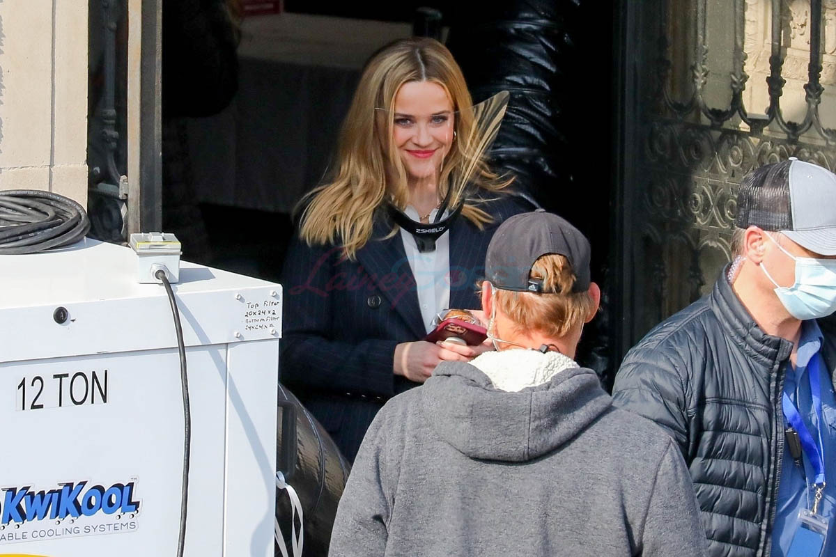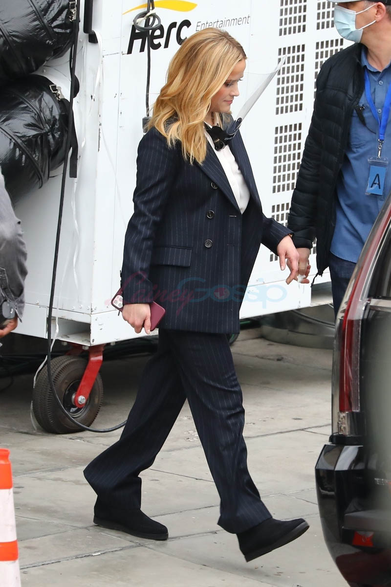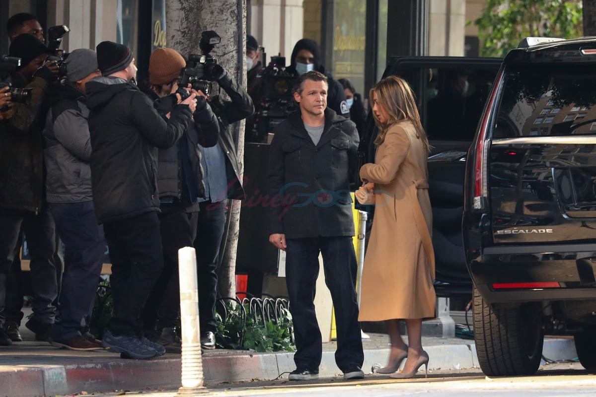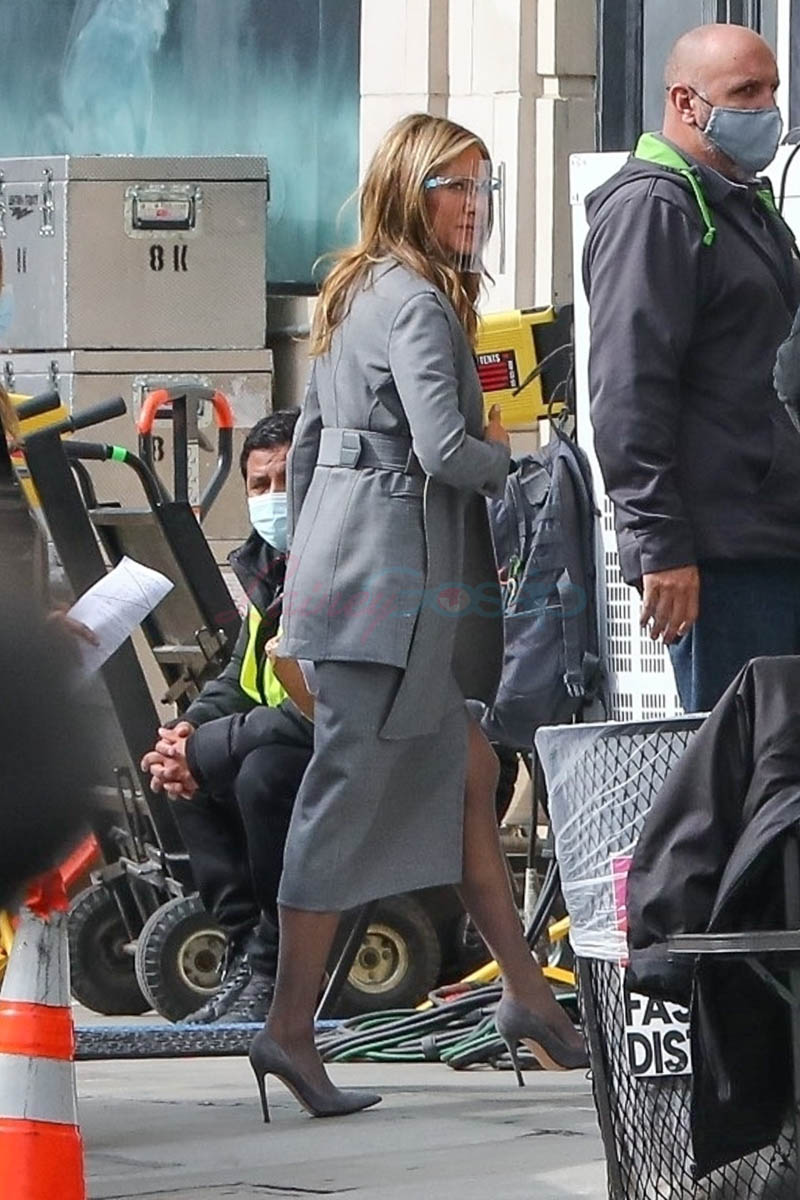 Here are Jennifer Aniston and Reese Witherspoon in LA working on the second season of The Morning Show. Jen was seen in a grey suit for one scene and a camel coat for another – very Alex Levy. Both at one point are wearing face shields. Have we talked about the fact that Julianna Margulies is joining the cast?! Variety confirmed this in December and she’ll be playing a character called Laura Peterson who’s a news anchor at UBA, the network that broadcasts The Morning Show. Will be interesting to see how that dynamic plays out.