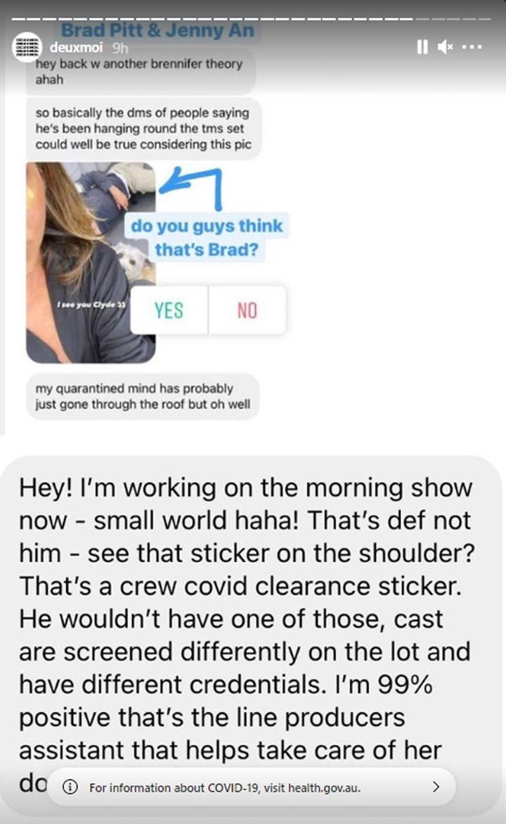 In other Jennifer Aniston news, last week people online were speculating about her and Brad Pitt after she posted a photo to IG stories with some dude lying in the background and some thought it was Brad, after DeuxMoi shared unverified tips they’d received from people claiming that Brad’s filming on a nearby lot and has come to visit her on set. That rumour has since been watered down: