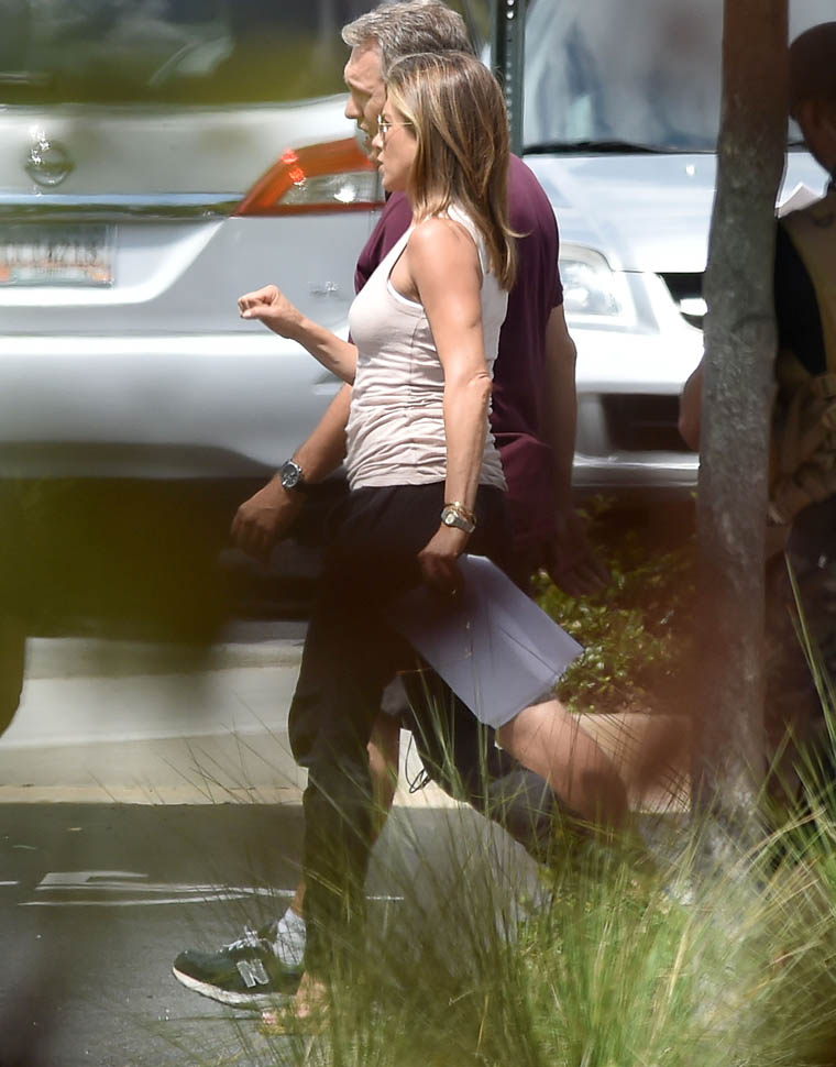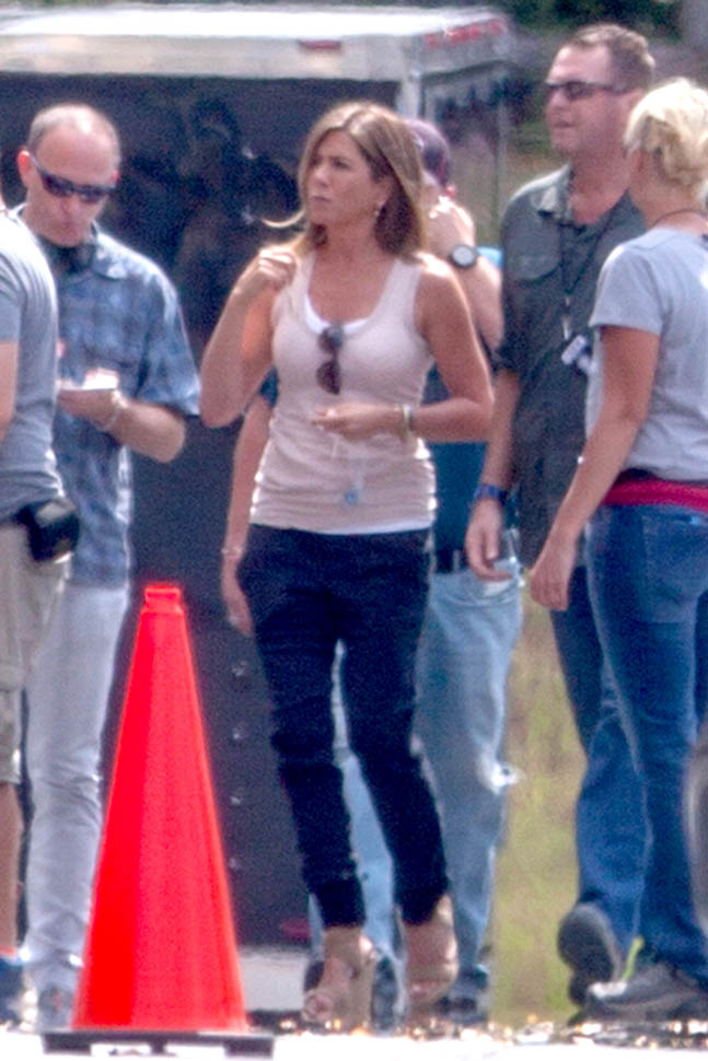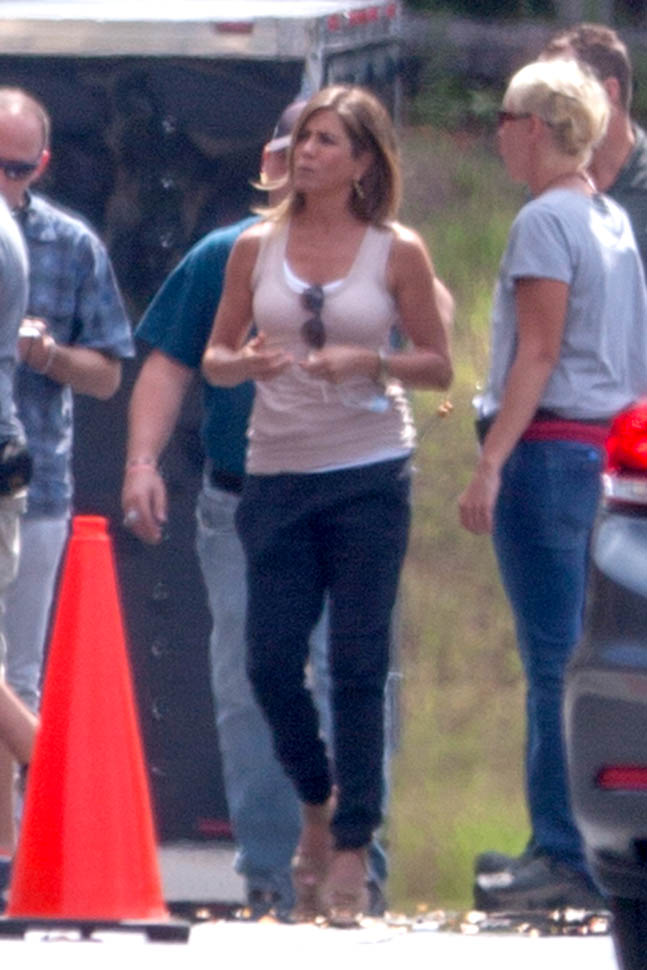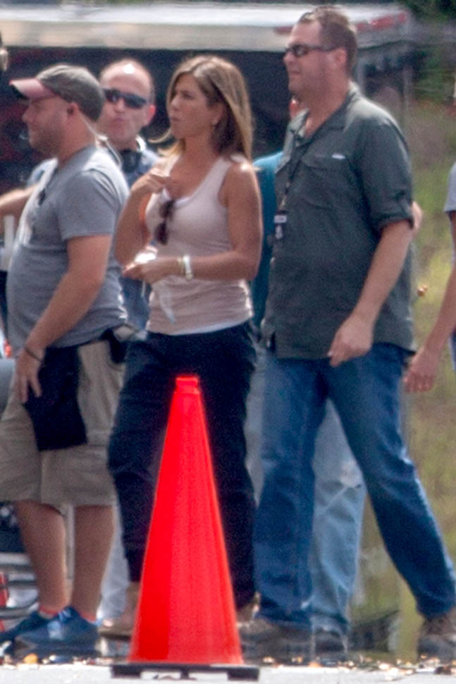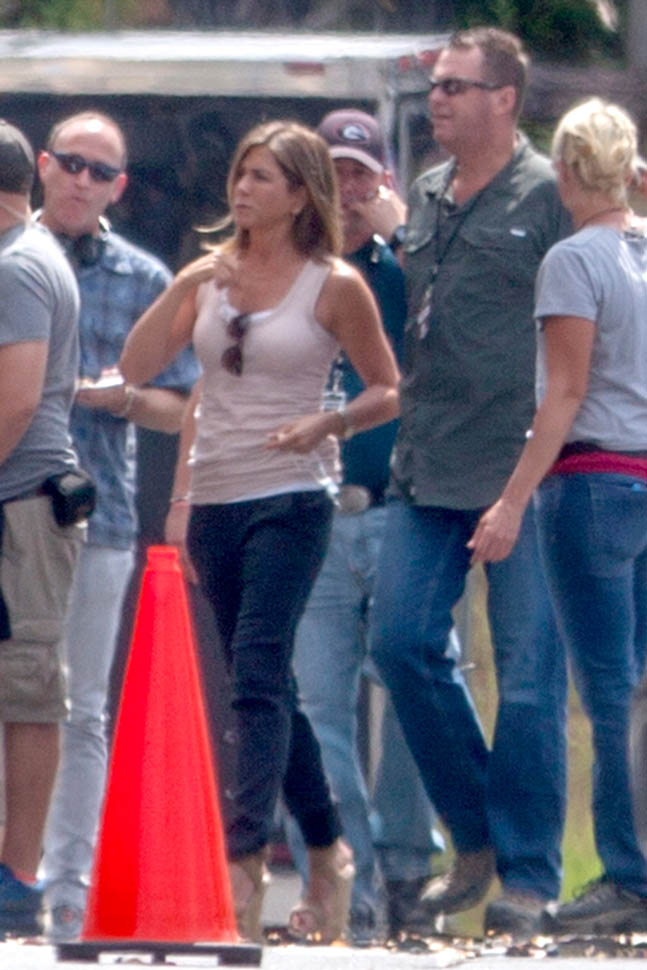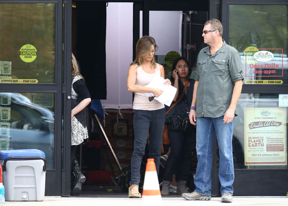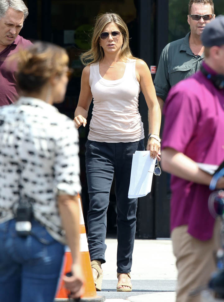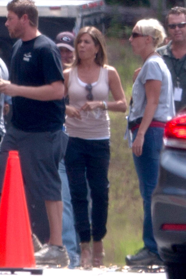 Fresh off her wedding and honeymoon, Jennifer Aniston is back at work, seen here in Atlanta on the set of Mother’s Day, directed by Garry Marshall. You’ll recall, Garry Marshall also directed Valentine’s Day and New Year’s Eve. It’s almost like he doesn’t know that holidays are already schmaltzy. Mother’s Day will be released in time for Mother’s Day 2016.