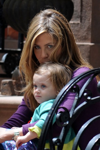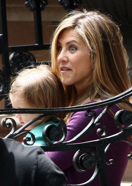 Check her out during a scene today in New York, making sure the cameras catch her pretending to be parent-y with a child. They also her caught her crazy eye moment when she remembered that Angelina has already conceived three Chosen Ones. Only Edward Cullen’s sparkly dazzle vampire venom could produce a more perfect child.