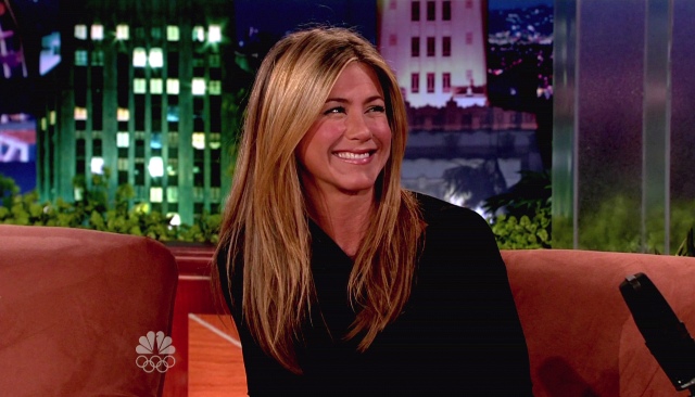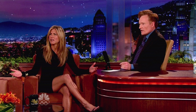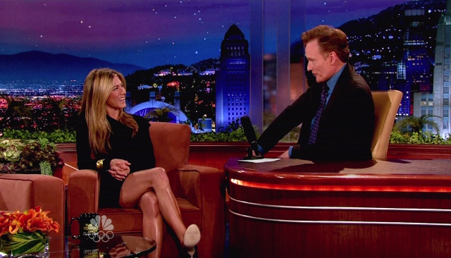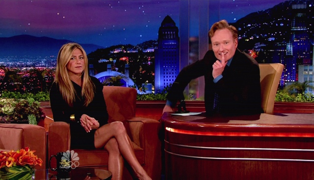 Attached – photos of Jen visiting Conan on The Tonight Show last night.