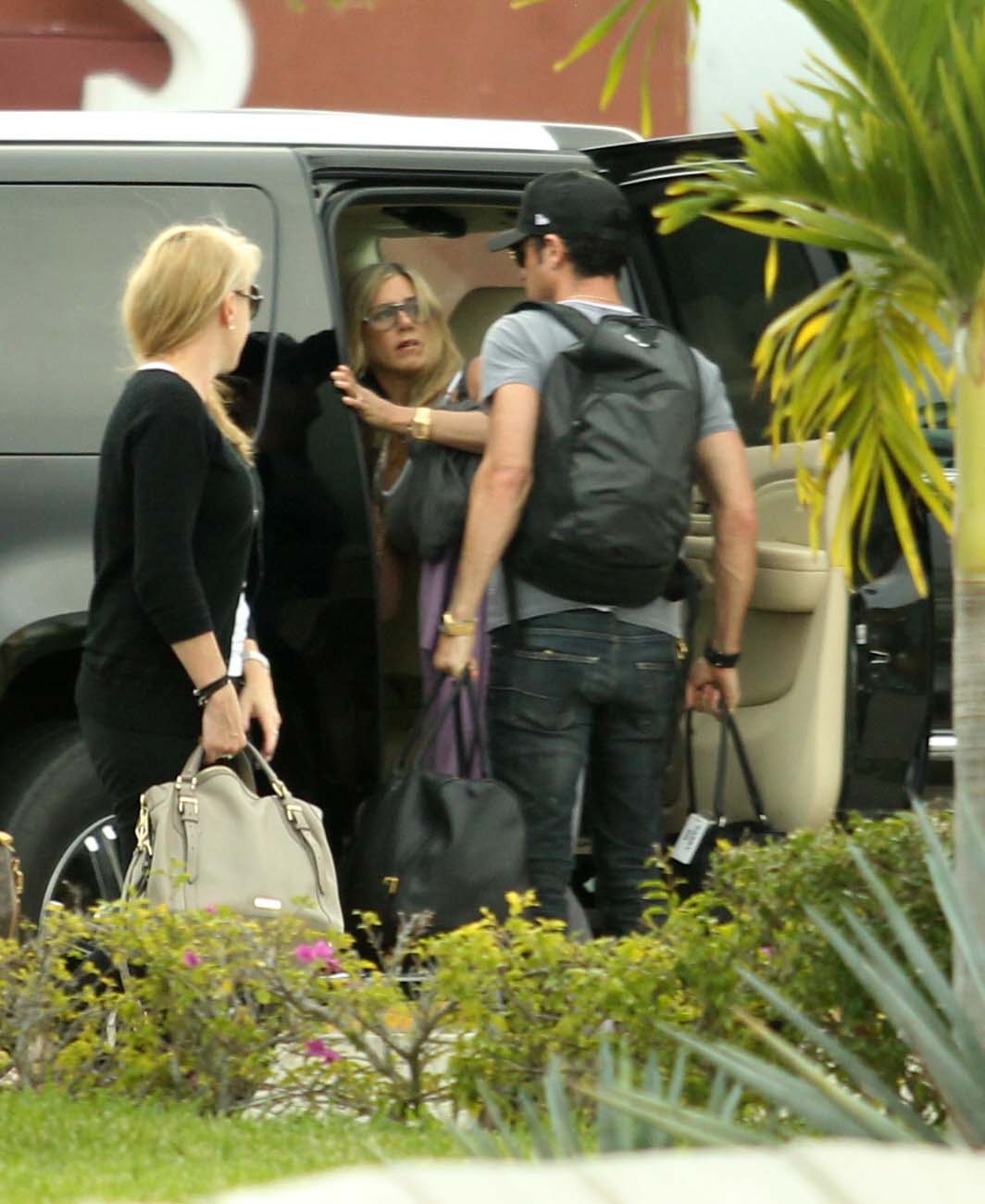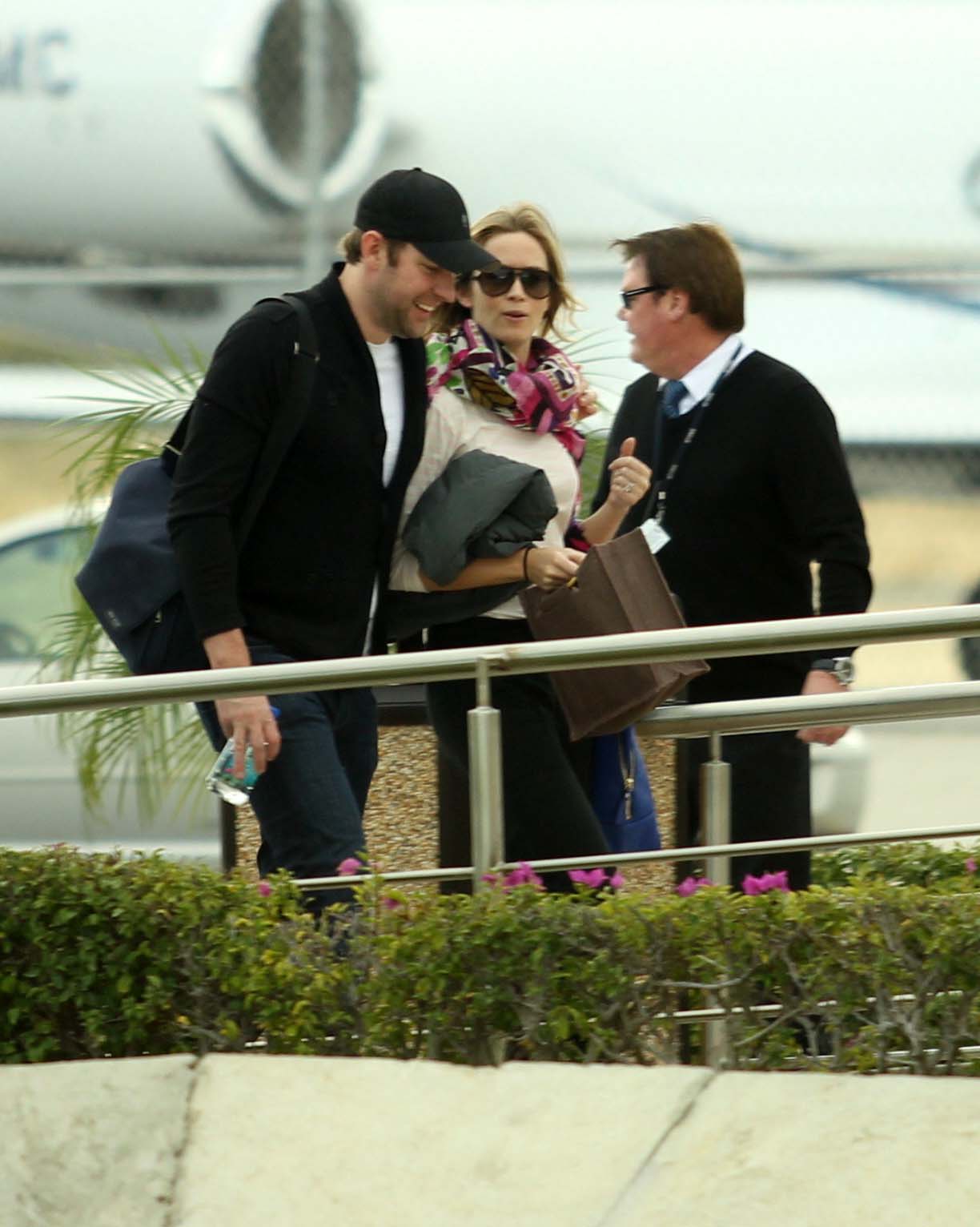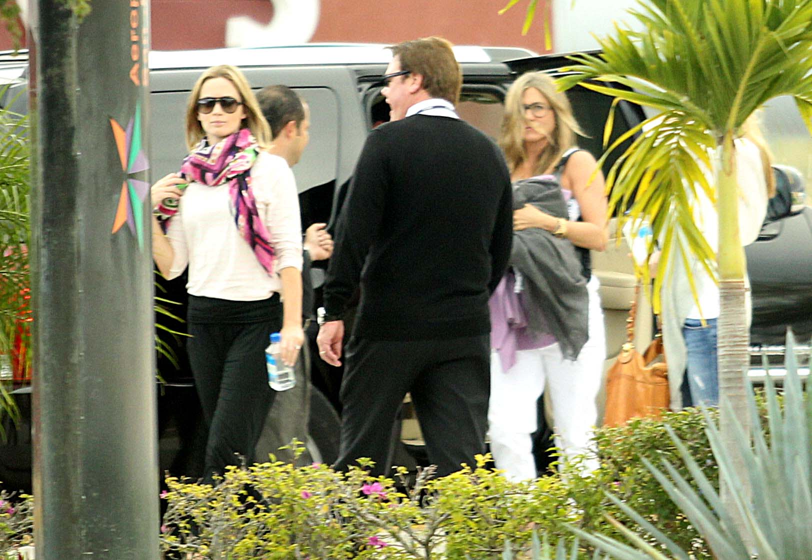 As you know, Jen and Justin Theroux have been on holiday in Cabo with Emily Blunt, John Krasinski, and Jimmy Kimmel. They left yesterday back to LA. I like her whites. As for Emily -- she's up for a Golden Globe next Sunday. She likely won't win, but it adds to what will be a very, very stacked carpet.