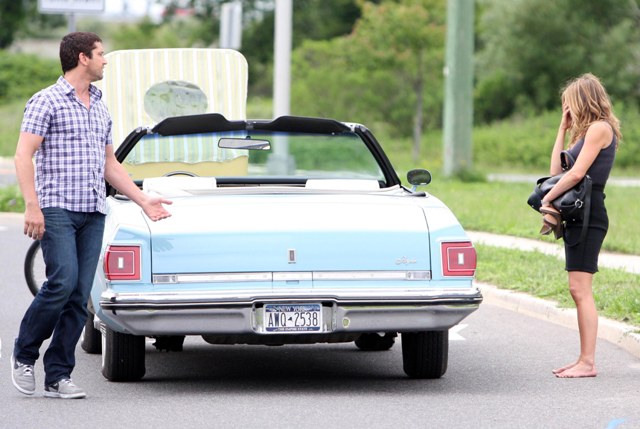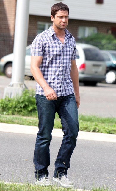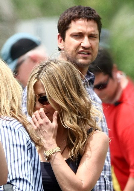 So the paps fortuitously shoot them out for dinner, just in time to make magazine deadlines, and suddenly this week she’s back on set of her new movie Bounty Hunter with Gerard Butler.