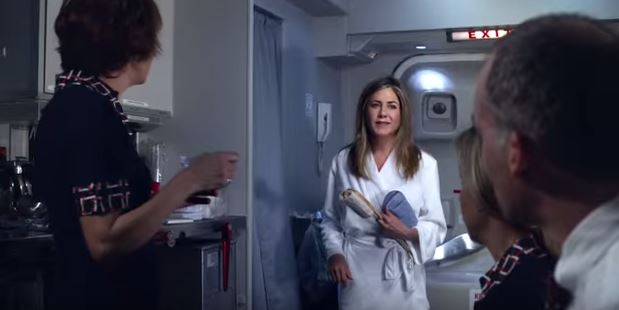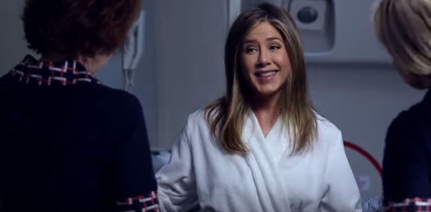 As mentioned a few weeks ago, Jennifer Aniston is now repping Emirates Airlines (click here for a refresher). The first commercial has now been released online. Jen’s in a bathrobe on the plane looking for the shower. She asks for help from some crusty airline employees who offer her nuts. Then she wakes up in first class and hits the plane bar, happy to be back on Emirates.