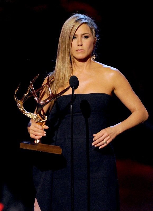Jennifer Aniston presented to Jimmy Kimmel at the Spike TV Guys Choice Awards this weekend with her hair styled fake Skrillex which means the MiniVan Majority can start doing it now. Also, as you can see, her shoe game still sucks.