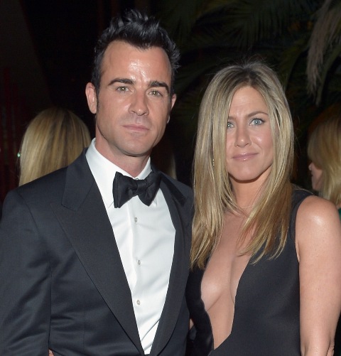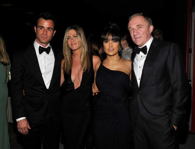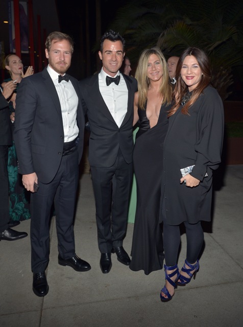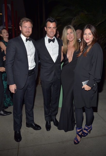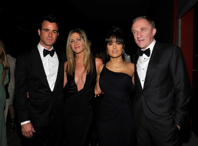 Jennifer Aniston and fiancé Justin Theroux hit up the LACMA 2012 gala this weekend. She wore an amazing long black dress, daringly low cut. And it’s very well done too. You can barely, barely see the figure skating sheer holding it together. But it’s there in a few shots where she’s twisted in a way that the material creases slightly, almost imperceptibly. And the colour isn’t pantyhose nude, right? It blends really well with her skin. Really impressively put together. And so flattering too with the diagonal panel on her left that brings in her waist.