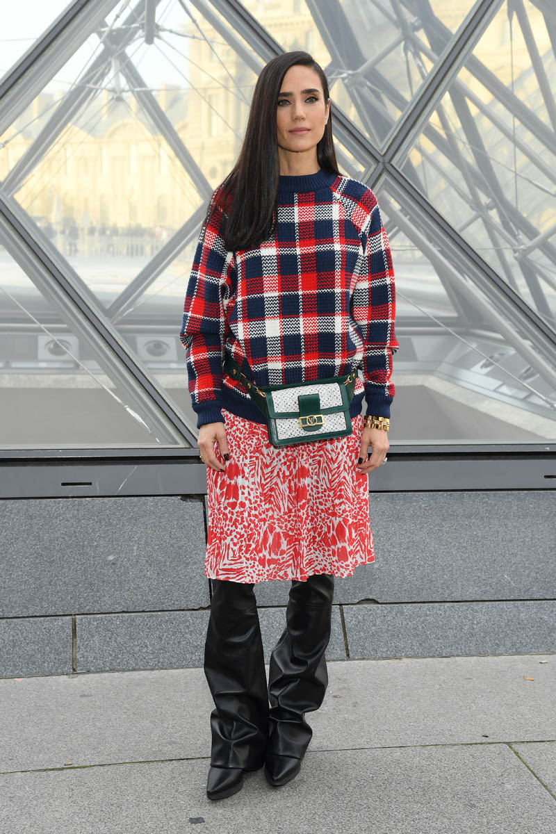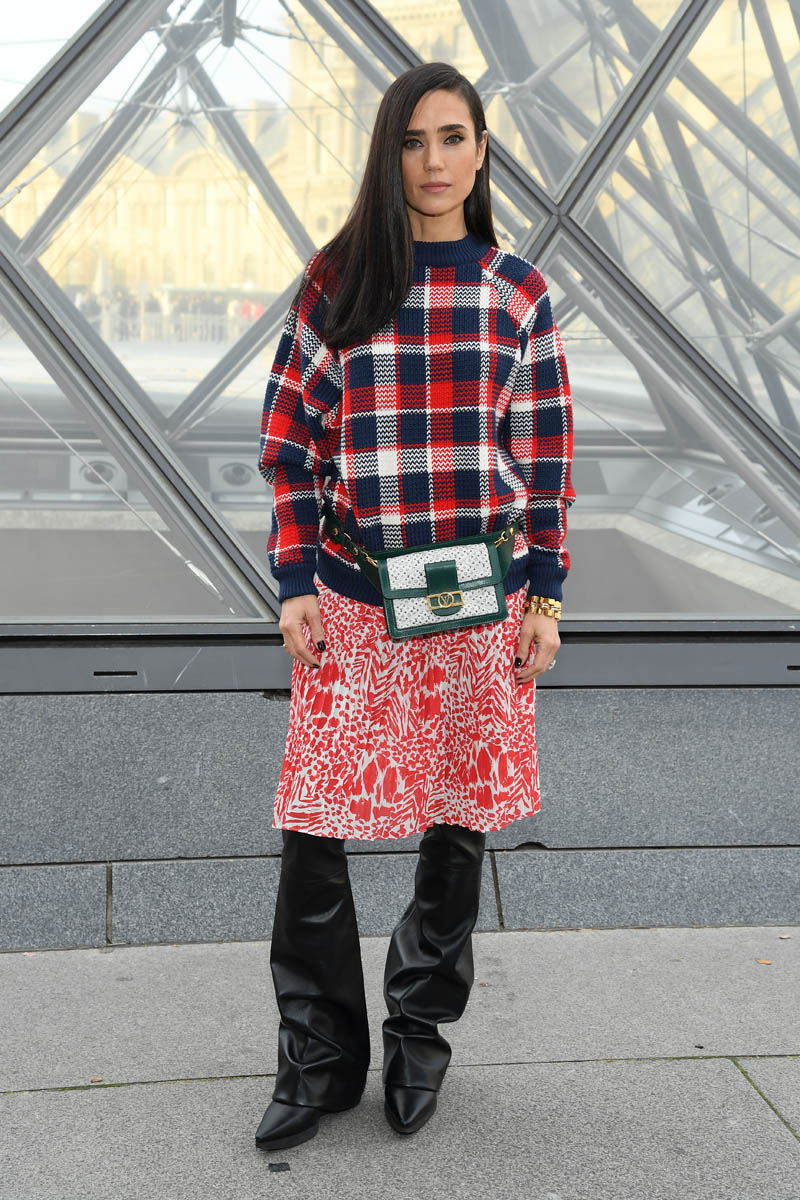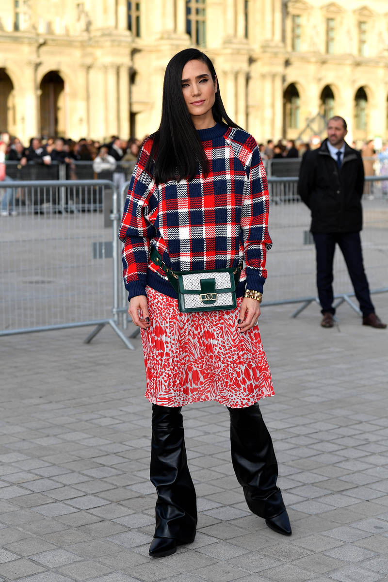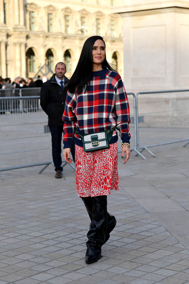Jennifer Connelly’s look at Louis Vuitton today is not going to be for everyone. I just… don’t know what you expect from people who are going to a fashion show DURING PARIS FASHION WEEK. Like, why, WHYYYYY would you not want to push style boundaries when that is exactly where you want to push them? The sweater is great. The sweater print clashing with the skirt is great. The long bottom-slouchy pants over the boots – yes, it’s weird, it’s not pleasing to the eye because it’s unconventional, but I don’t mind it on her and if there’s a problem that would be it: this is such a high degree of difficulty, few can pull it off which brings me back to the original point that if you’re going to try it anywhere, it might as well be PARIS FASHION WEEK.