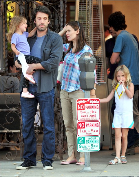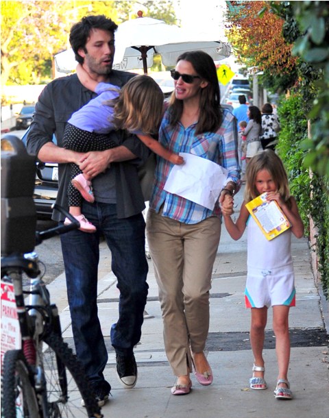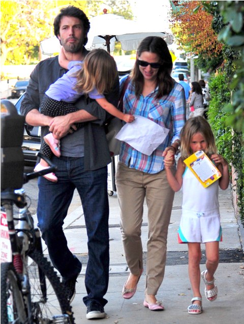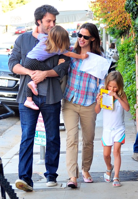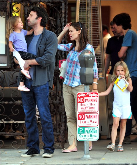 Here are the Afflecks yesterday out for dinner with their girls. Ben’s doing a nice job lately getting in some family exposure time. Must be that gambling scandal. As for Jen – again, you can excuse it by saying, oh she’s just wearing her Mom gear and you can’t blame her for that ... until you look down at her shoes and you realise, those are not “comfort” shoes but “deliberate” shoes, “I want to wear these because I think they are pretty shoes”, with a plaid shirt!!!