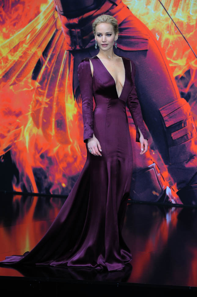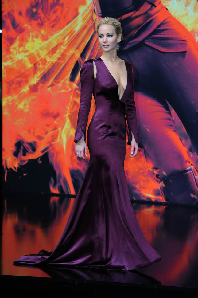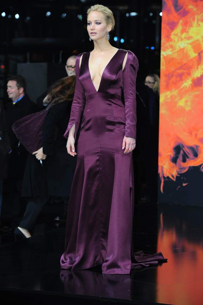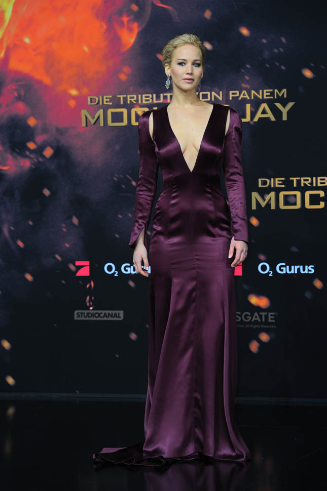 Here’s Jennifer in Berlin tonight at the Mockingjay premiere. I hate this dress. It’s that f-cking material. It’s the worst material.