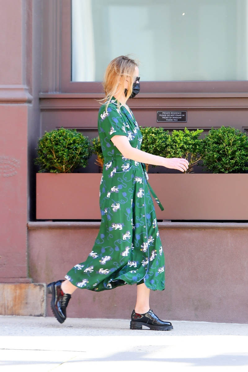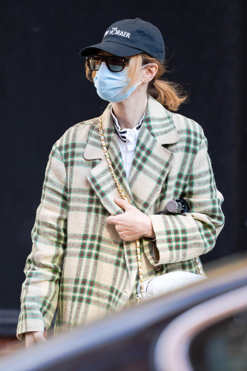 Green seems to be the favoured colour for her this week – check her out here in a pretty green dress, a look I’ve loved since Winona Ryder in Reality Bites: long dresses with oxfords, it’s timeless. Green shows up more subtly on this checked coat. Although now that I’m taking a closer look, I’m not actually sure this is her. The paps are saying it is but if it is, then she’s had a hair change because it’s a lot shorter in these shots than in the other ones. As I’ve been saying since the start of the pandemic, this is how mask life will benefit celebrities.