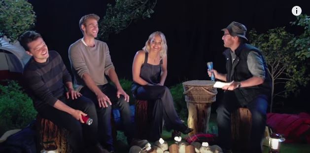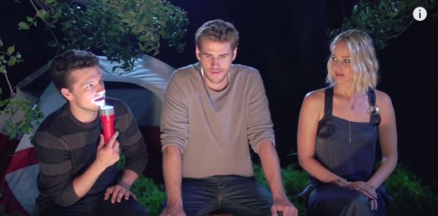 Jennifer Lawrence, Josh Hutcherson, and Liam Hemsworth have started promotion for Mockingjay 2, the end of The Hunger Games. All three were with Josh Horowitz for an MTV interview around the “campfire”. And, of course, because it’s Jennifer Lawrence, part of the conversation became about their most disgusting habits. Well, no, it started with Josh Hutcherson’s most disgusting habit. Which I totally agree with because I hate spit and I hate seeing it gather in the corner of people’s mouths, and he makes spit bubbles sometimes when he’s just, I don’t know, not talking, and then he demonstrates and it is indeed really disgusting.