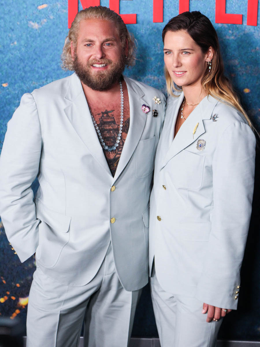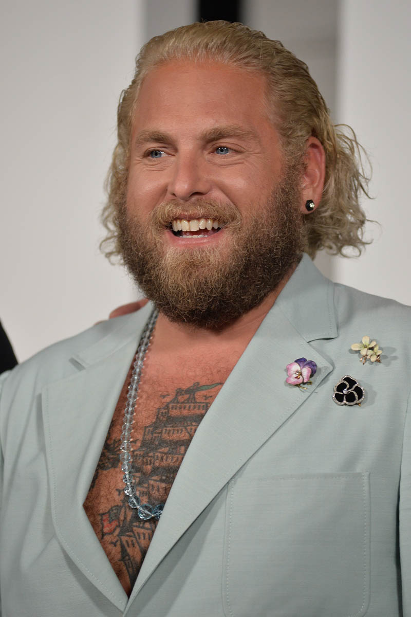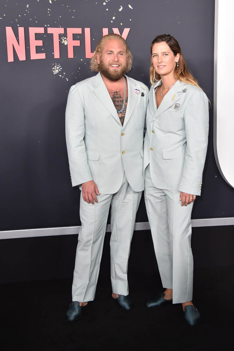 To go back to Jennifer, she’s wearing Dior, a gorgeous golden gown with a sheer micro-pleated cape, marking a spectacular return to the red carpet. I also really love Jonah Hill’s look with the blonde greased hair, the open neck, and that turquoise necklace to match the suit. It’s Miami Vice and the beach. And why not when there were no red carpets for so long, let’s play, let’s be the one to have fun with it. You know Leo’s not going to.