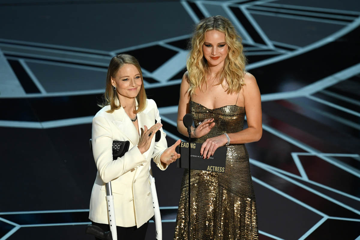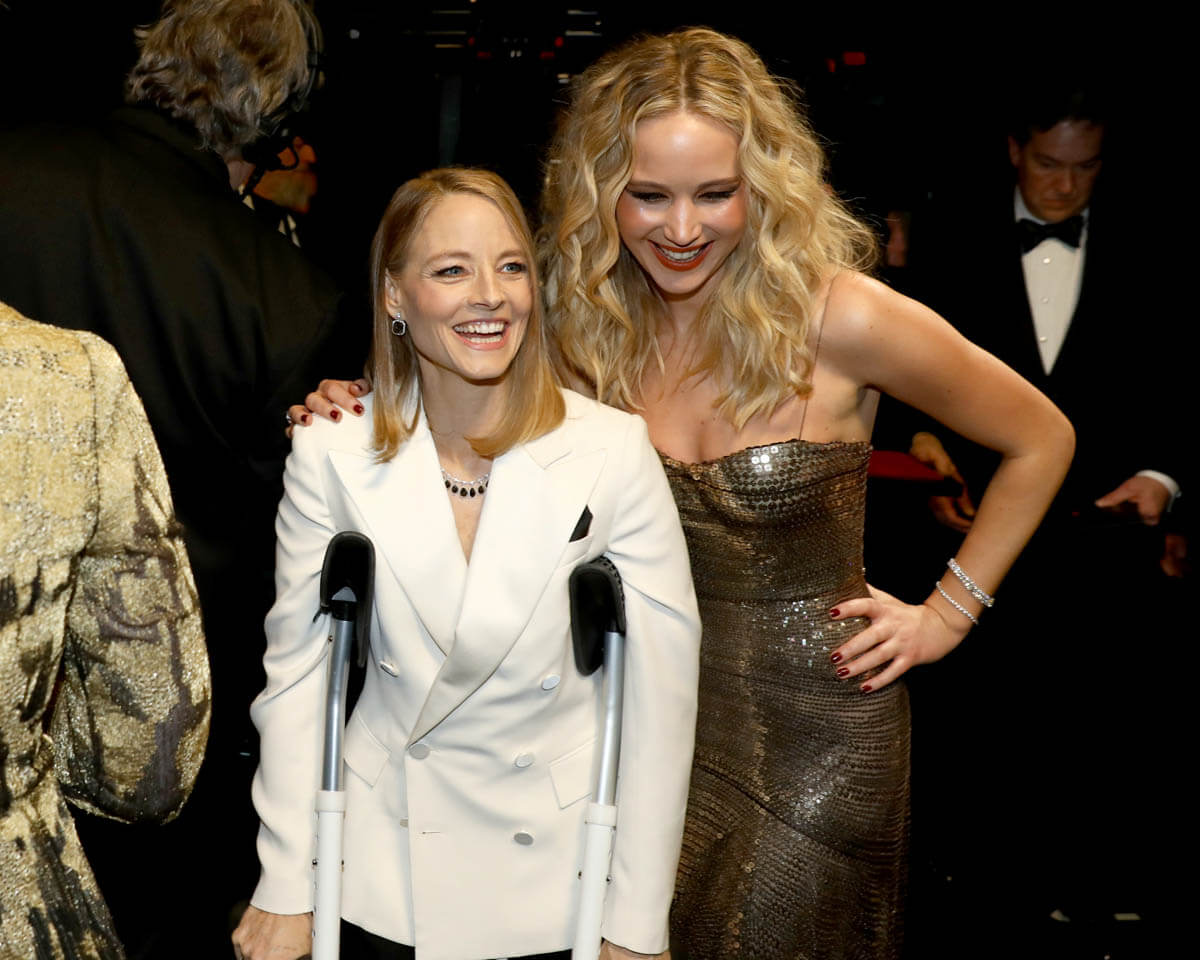Please take a minute to appreciate the height differential between Jennifer Lawrence and Jodie Foster (on crutches):