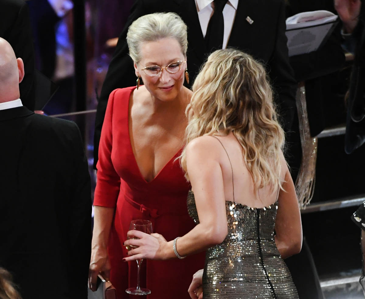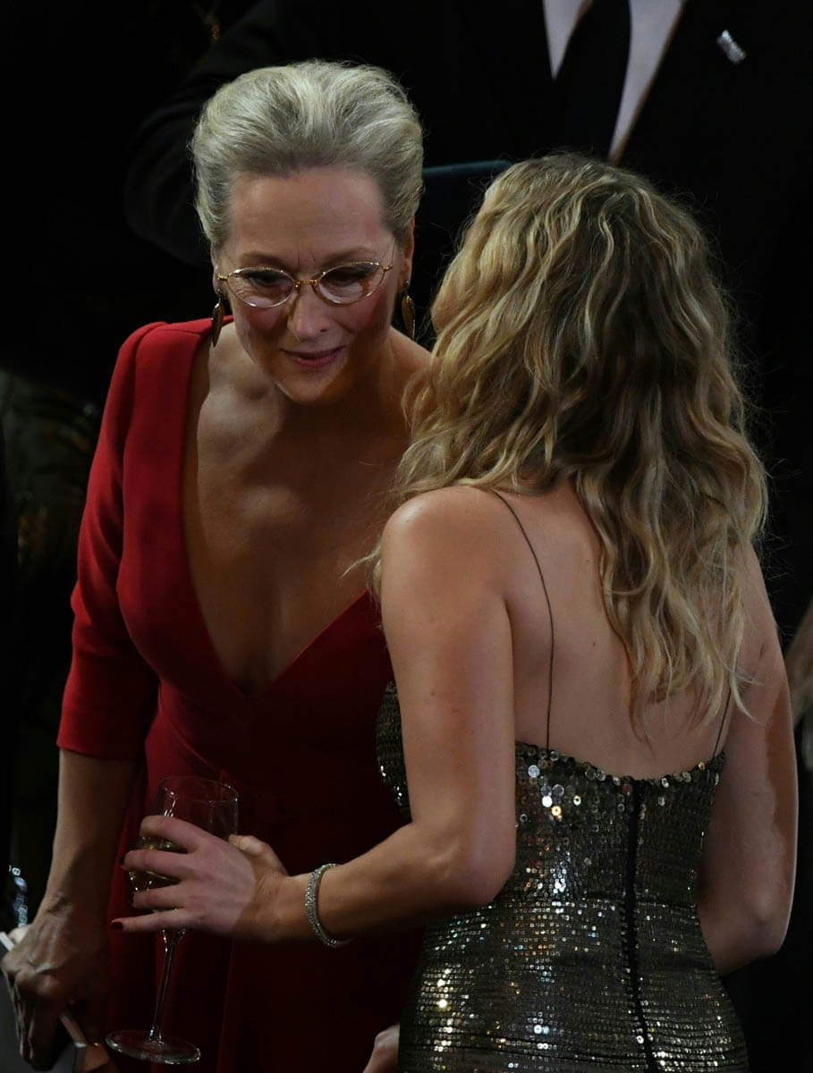 Also authentic, if less charming, is the fact that Lainey watched Jennifer Lawrence arrive on the carpet and then skip the line of people who had been waiting to pose against the photo wall for a half hour to get her shots in and breeze inside. Lainey and her balcony cohost Danielle Graham noted that it was her powerful publicist who made it happen (but it’s not like Lawrence objected). I’ll choose to believe that she heard Jodie was on crutches and thought they needed to have more pre-presenter drinks than usual to account for the unusual transportation. But would she have done it if Meryl had been watching? Discuss.