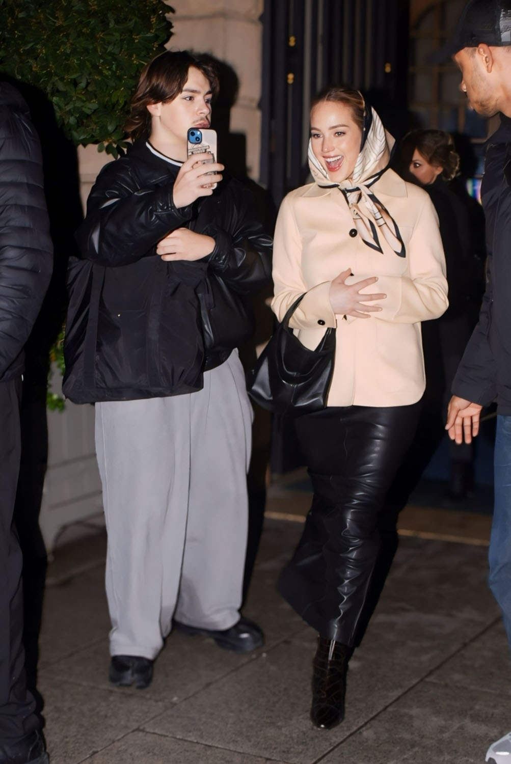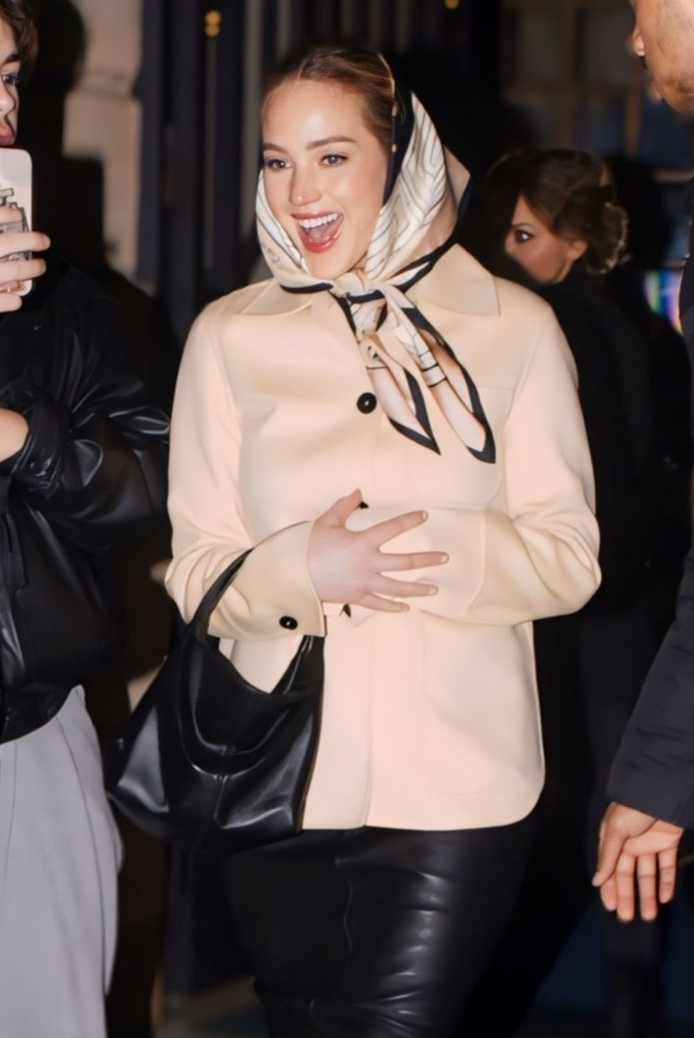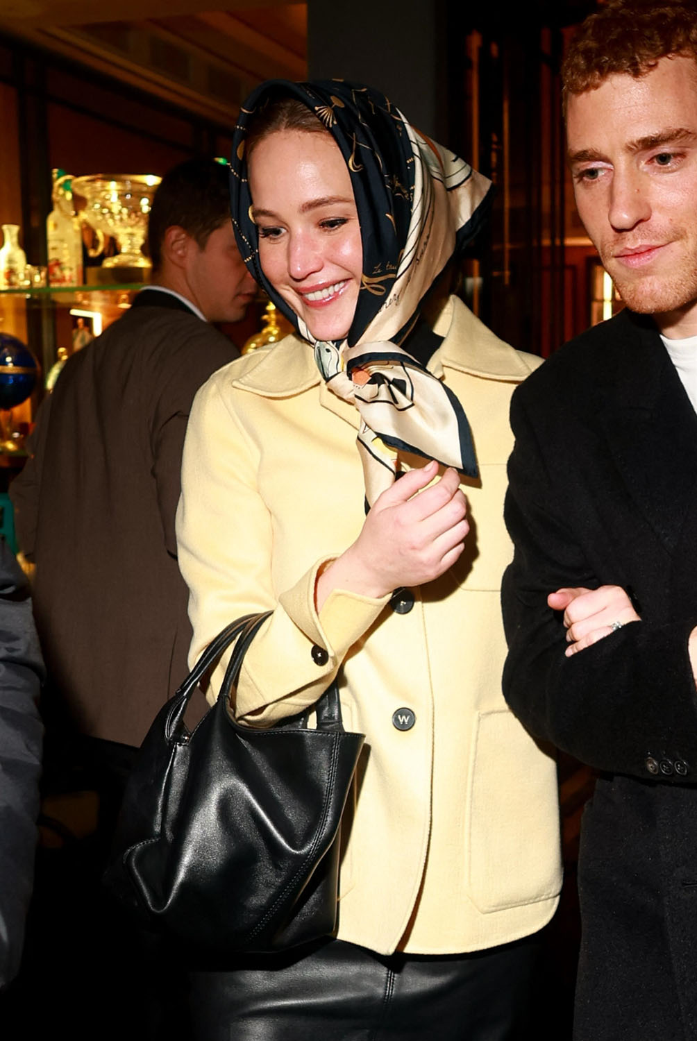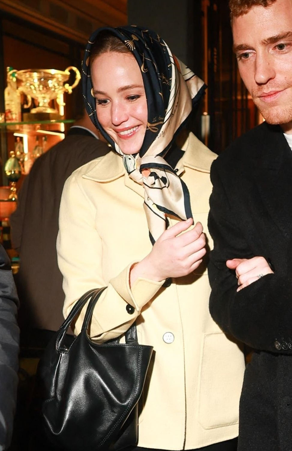 Jennifer Lawrence is still in Paris following the Dior runway show. She was at dinner last night and was photographed wearing a scarf tied around her head like my grandmothers used to do.