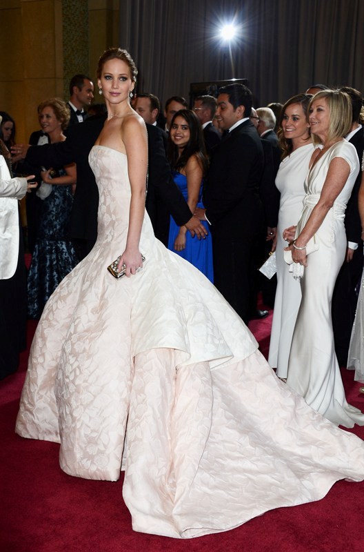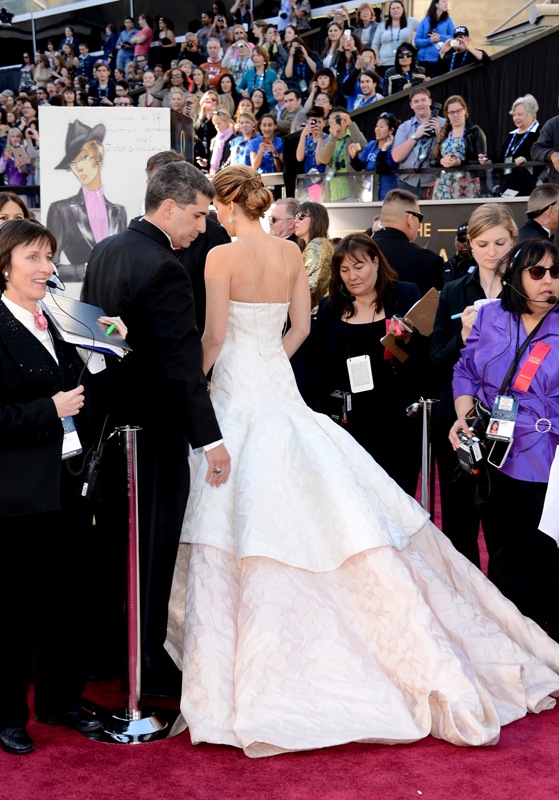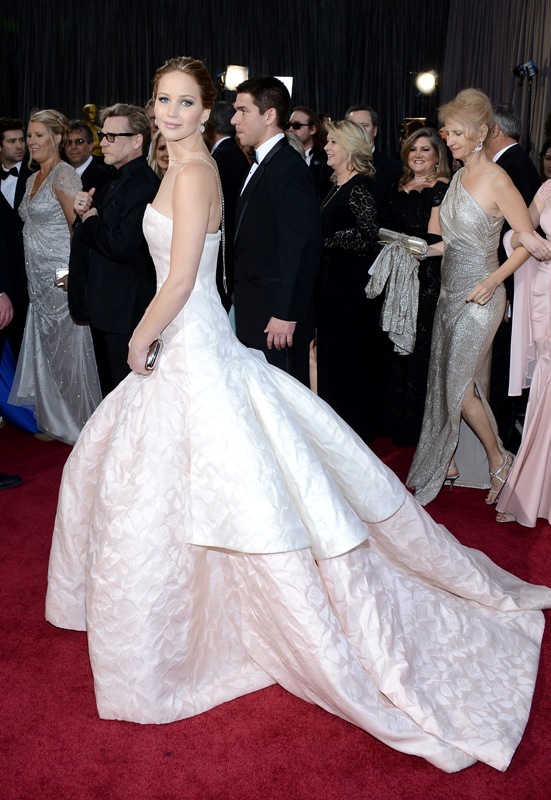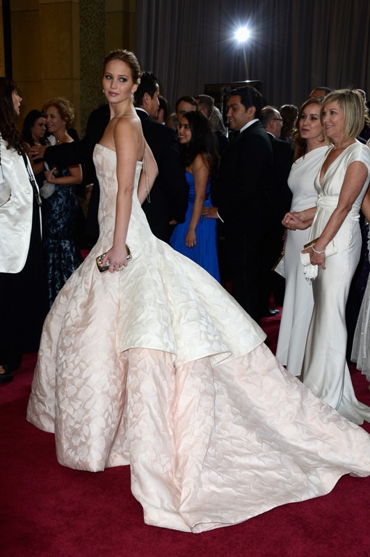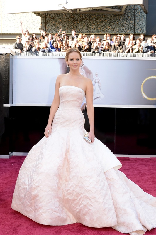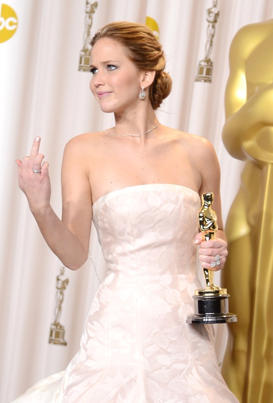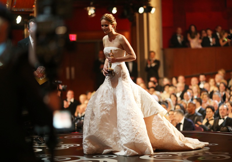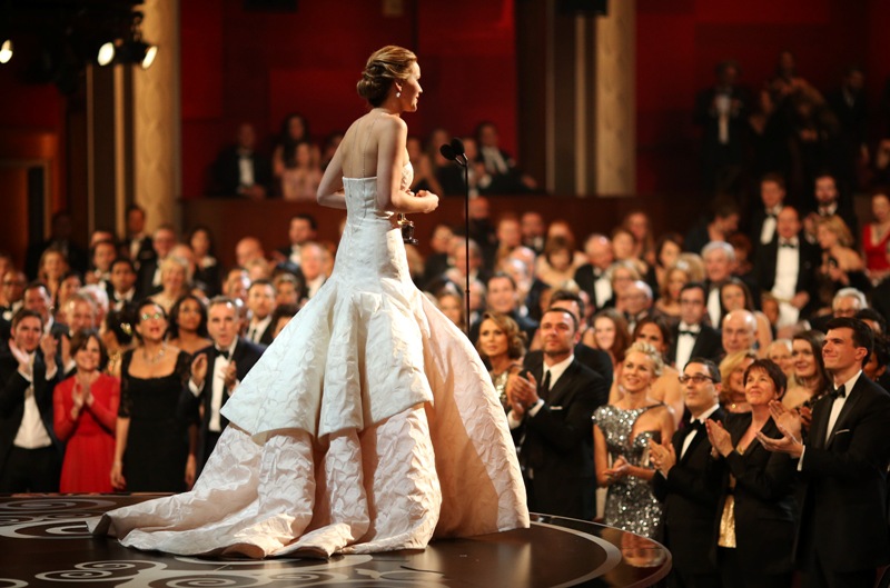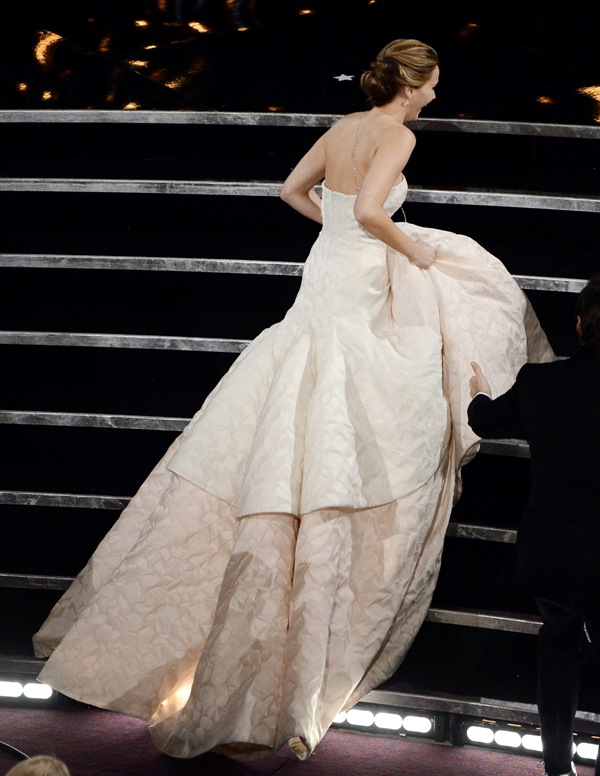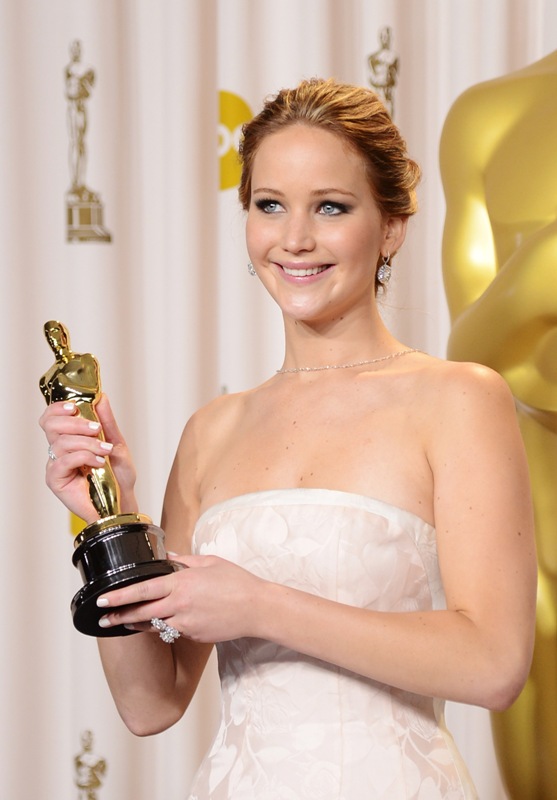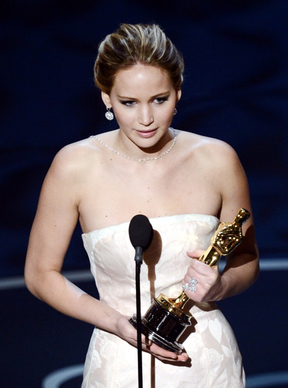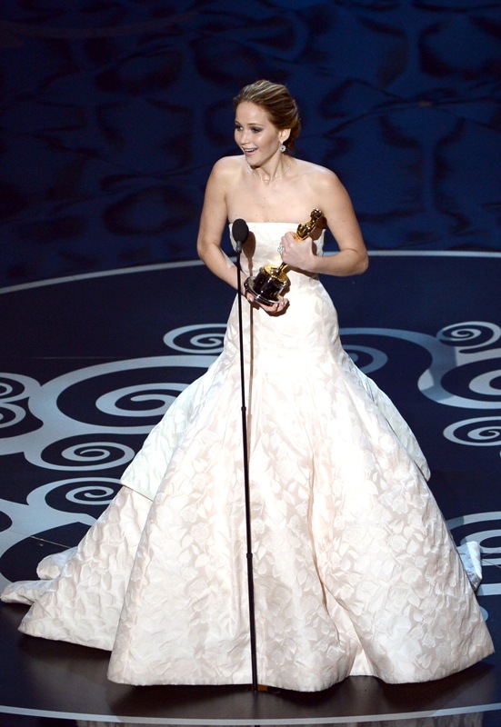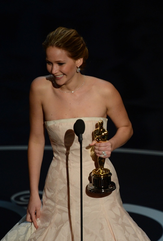 Duana and I have been discussing it all day. Right now, we are in love. Jennifer Lawrence is irresistible, the proverbial “real girl”. She charmingly trips on her dress and manages to survive the mortification without tears and self-consciousness. She makes it through an ENTIRE award season without wearing Marchesa. She sasses Harvey Weinstein in front of millions of people about his shady reputation and gets away with NOT thanking him. She heads backstage (in quick time, by the way, unlike Anne Hathaway who showed up hours after winning hers) and charms even the most cynical journalists, including one who asked her if she’s worried it’s too much too soon and that she’s peaked too early.