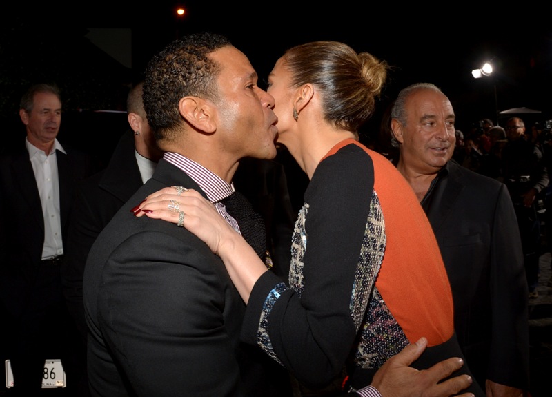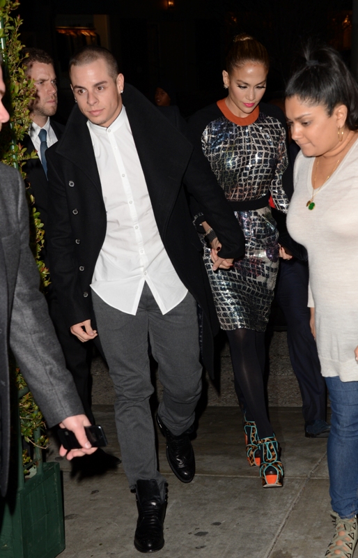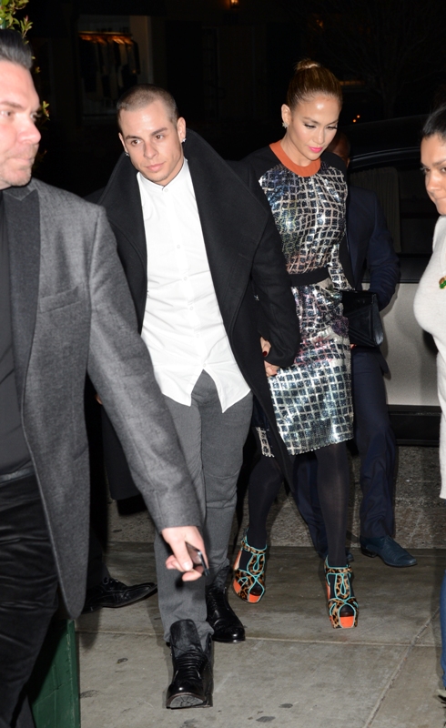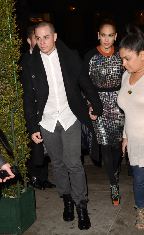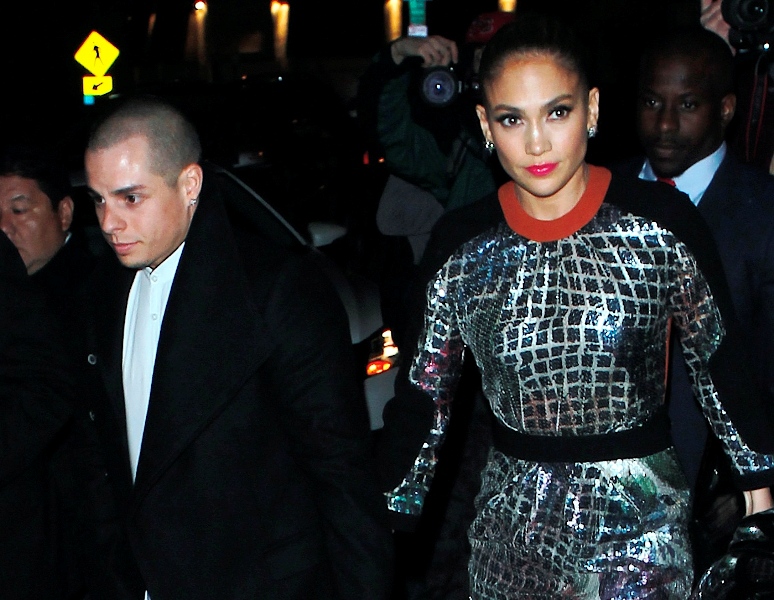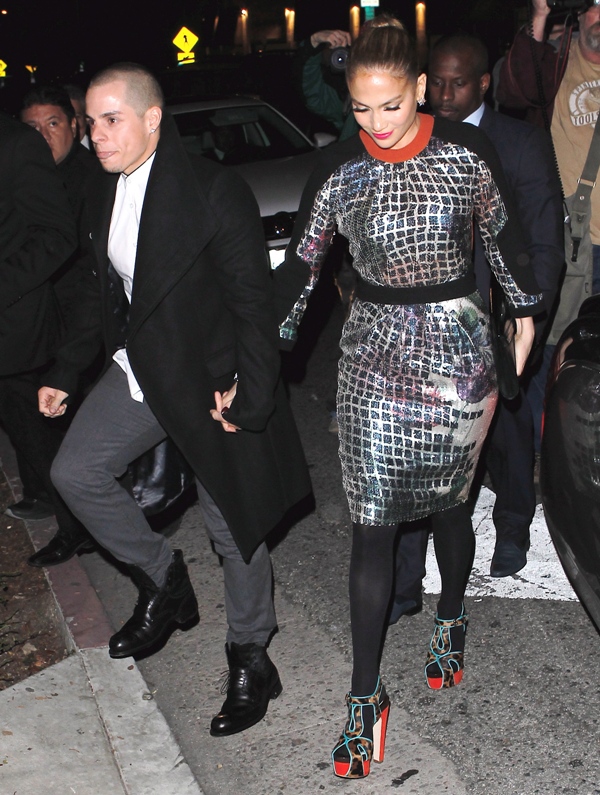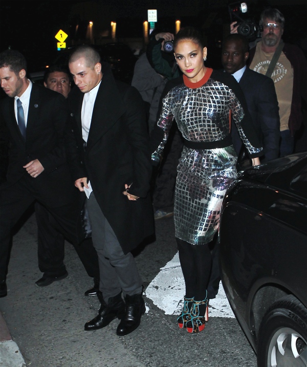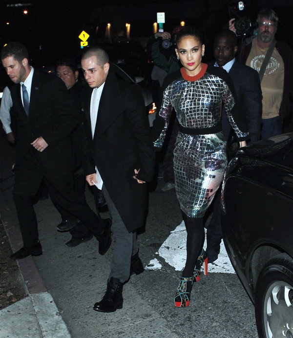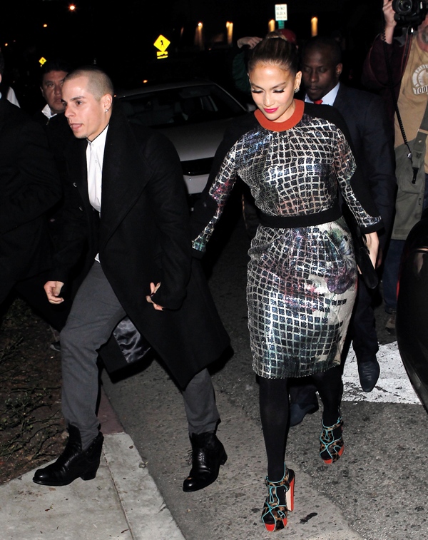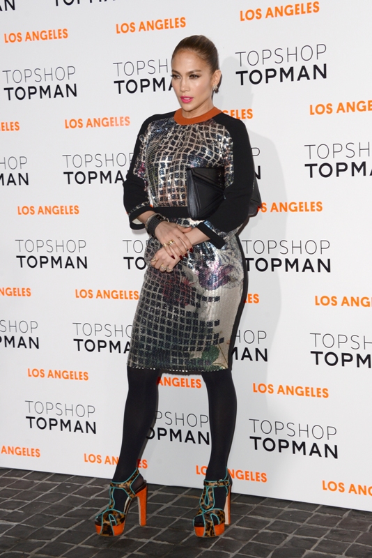 JLO and Slum Bear hit up the Topshop party last night in West Hollywood. The dress isn’t very flattering but it’s better from the back. Hideous shoes though.