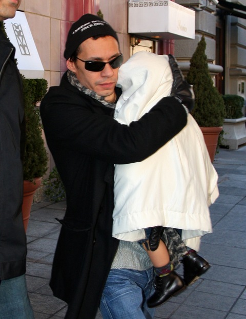 Also attached – Jennifer and Marc carrying their twins out of the hotel on Sunday. My interest in babies, or lack thereof, being what it is, I don’t normally notice such things… but even I couldn’t help smiling a little over Max’s little leather boots. You think Jennifer Lopez would ever let her children wear Crocs?