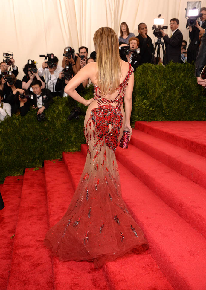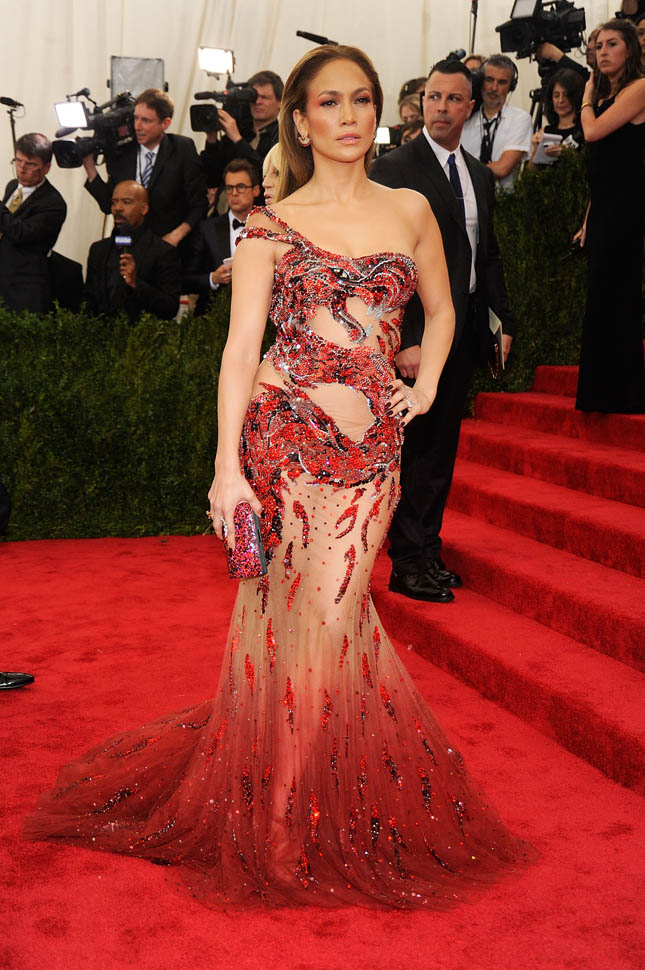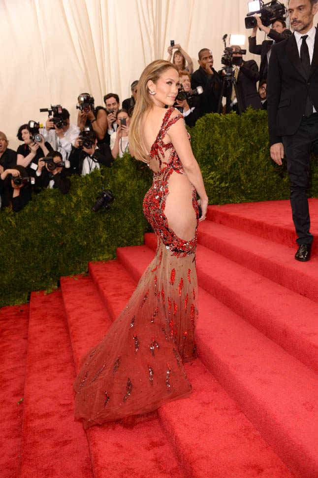 It’s Versace. But it could also have been Zuhair Murad. What’s the difference? Beading held together by pantyhose – who can tell it apart? Doesn’t matter if there’s a dragon because f-ck, I’m so over it. I’m so over JLO in these kinds of dresses. I’m so over “body-con” as a substitute for imagination. Click here to see pieces from Donatella’s S/S 2015 runway. They’re all just variations of one (boring) brand of sexy. And why should that be rewarded? No. It’s too easy. And I’m deducting points for the red eye shadow.