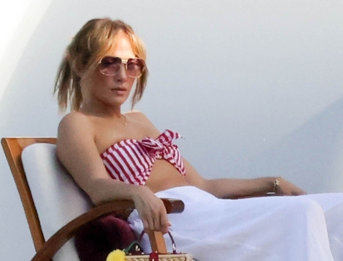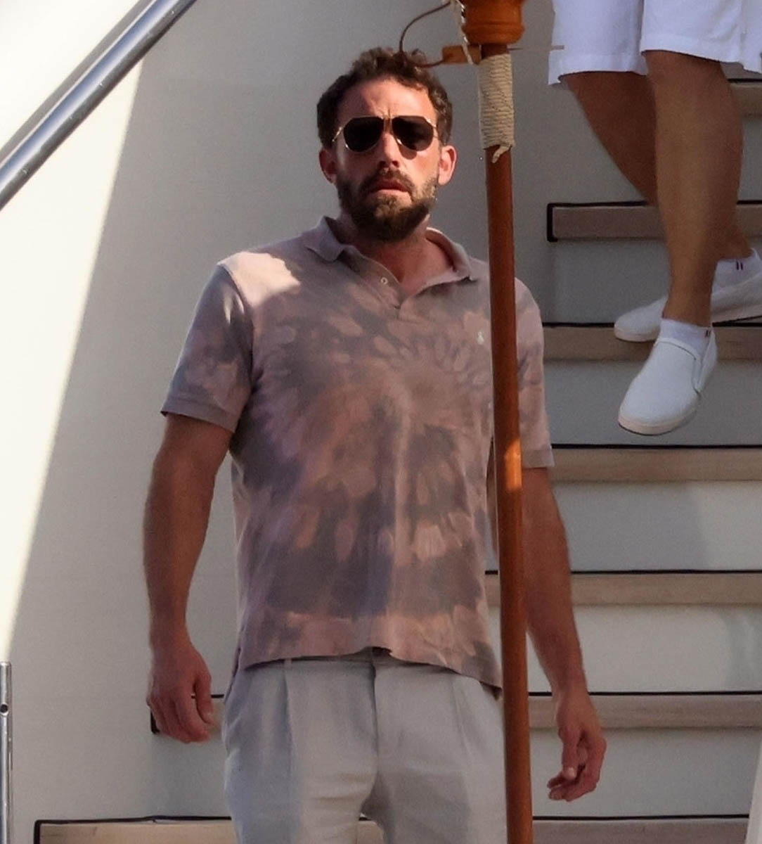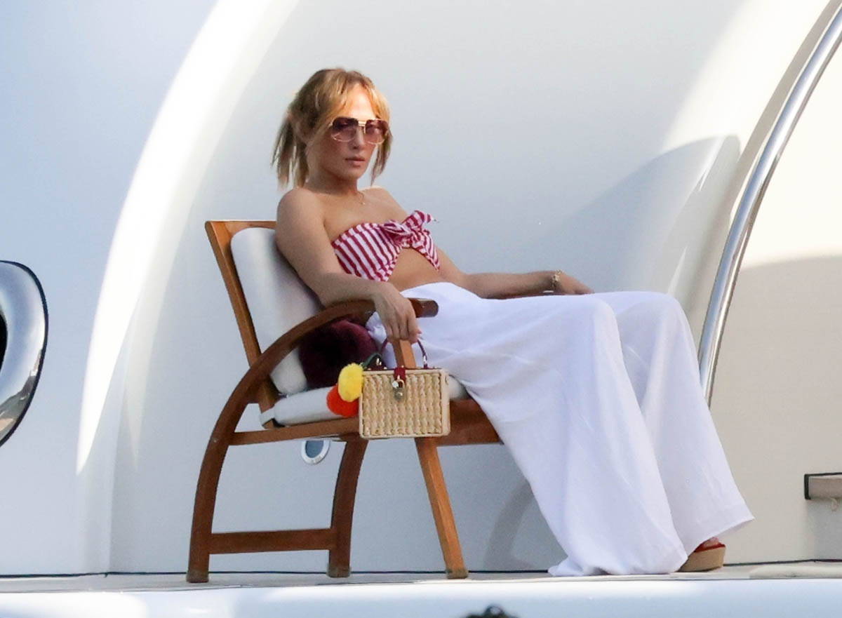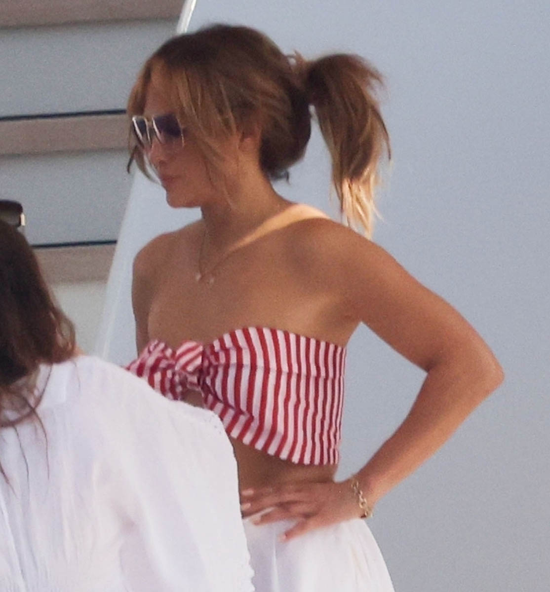 JLo isn’t giving up any bikini shots today. That, I guess, was a birthday special. This red and white striped bandeau though is adorable. And it’s a full outfit, a proper yacht outfit, not exactly lounge wear. Ben’s clothing is noteworthy too. It’s a tie-dye polo, which I like on him. And I like that he’s keeping it him – the shirt is untucked, the collar is way open, so even for those who are suggesting that his wardrobe is getting an upgrade because they’re together, unlike how it was back in the OG days, they’re finding a space where Ben’s style vibe can be slightly elevated, but stay within his lane.