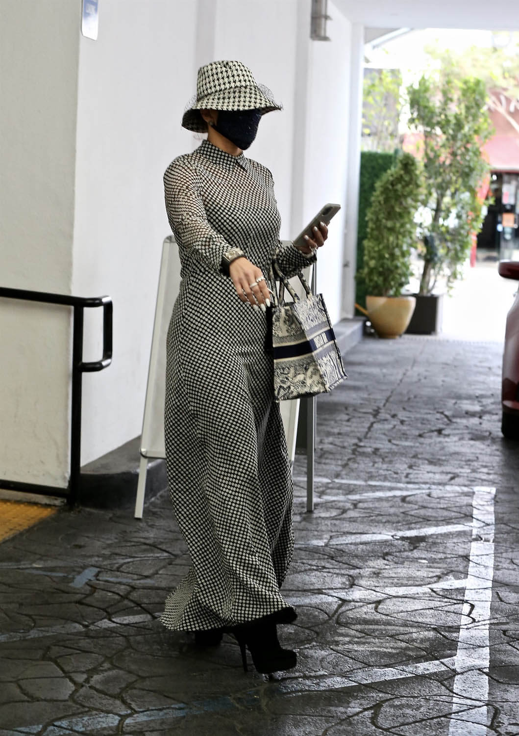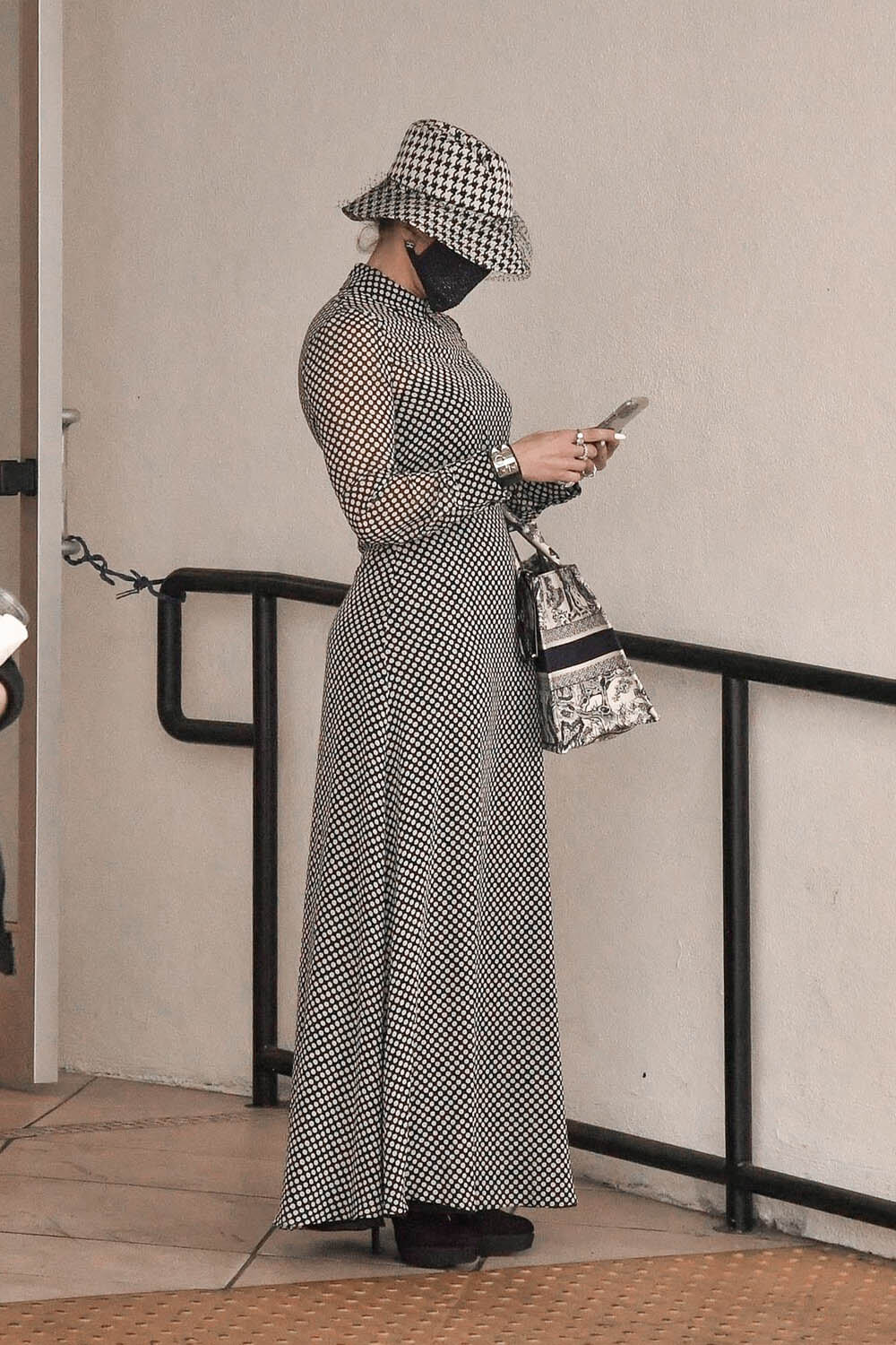 JLo’s clashing a lot of prints here full-body from head to toe with the dress and the hat and the bag. Is it working for you? I think it works for me, even though I don’t love the dress. I like the collar for sure. I like the length definitely. But I wish it wasn’t sheer. It would be so much cuter for me if it wasn’t sheer.