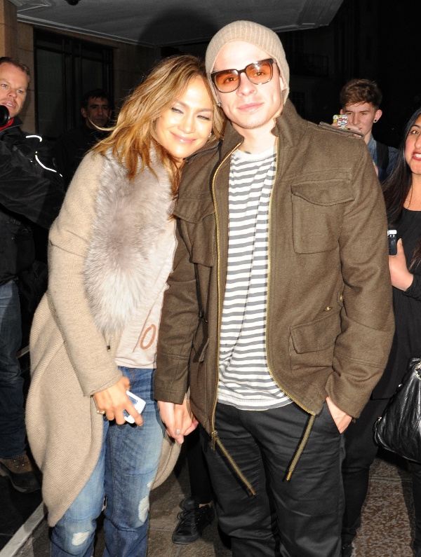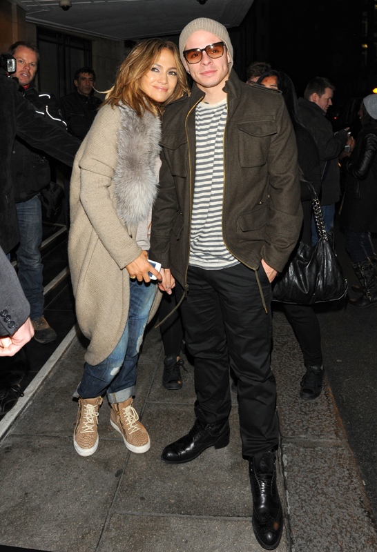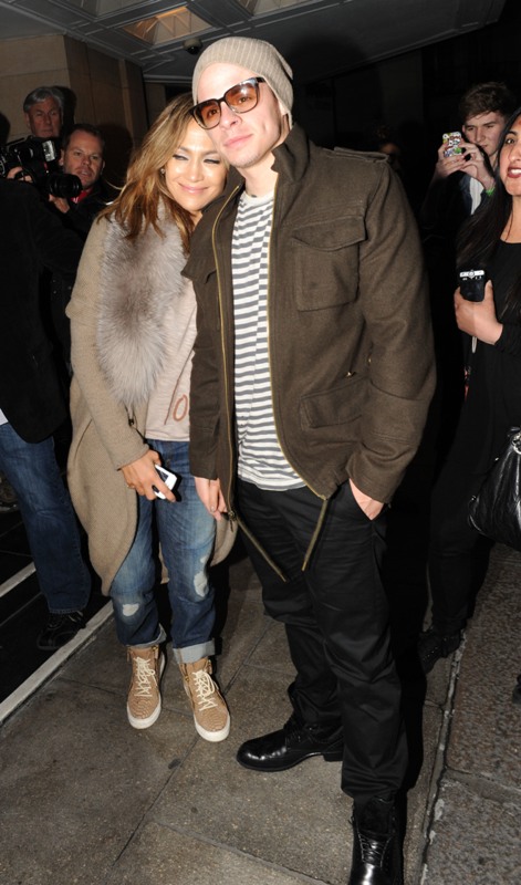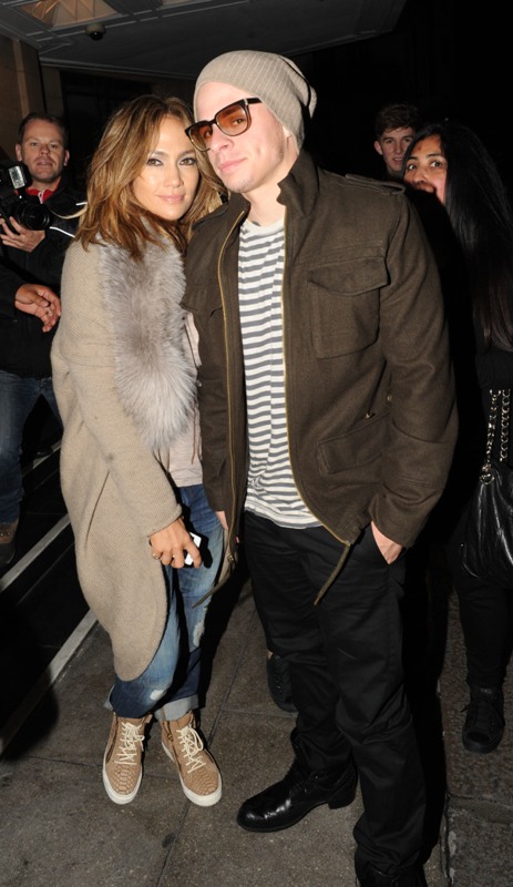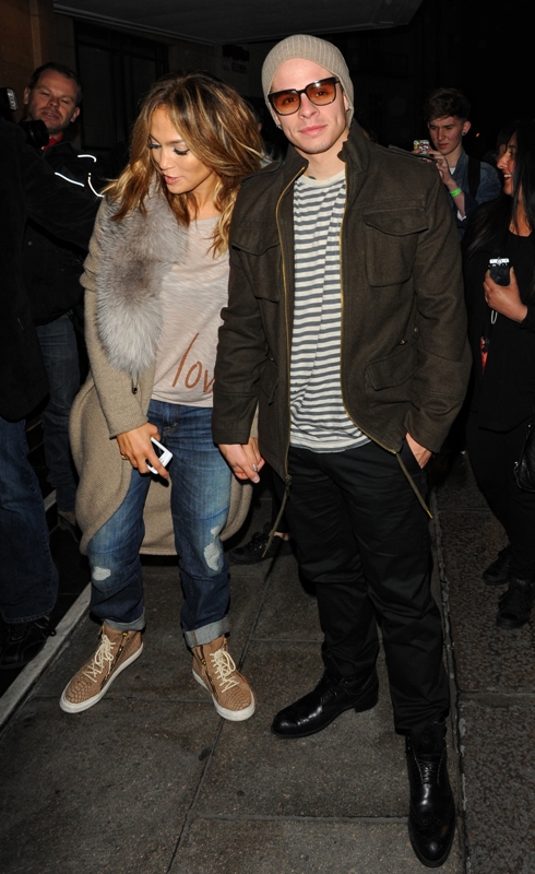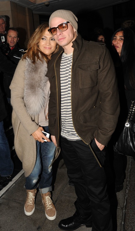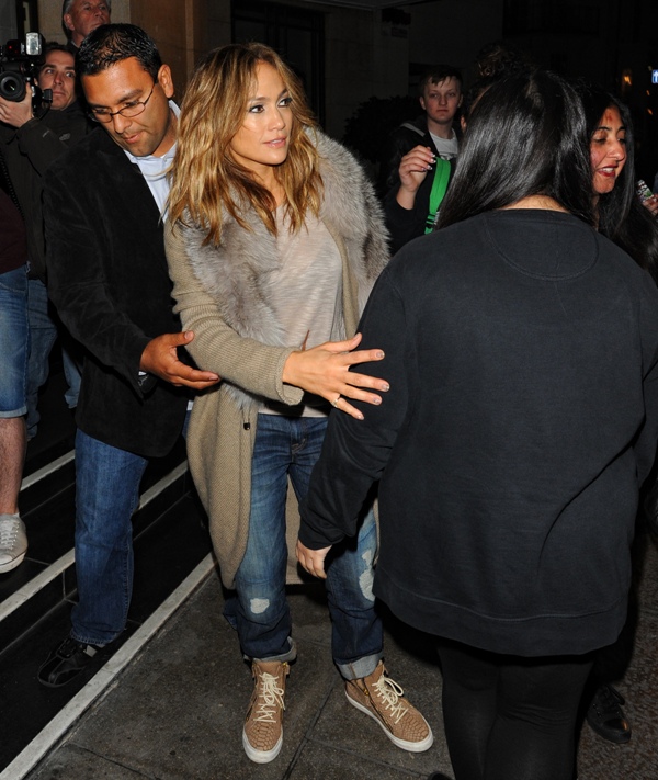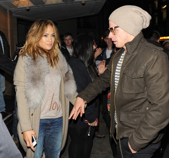 Not surprisingly, JLO was joined by her Slum Lover on this trip. Here they are, being the Bears, arriving back at the hotel. There were fans outside waiting and JLO spent some time with them. I am SO relieved that so far there don’t seem to be any shots of fans asking HIM for photos and autographs. At least not that I’ve seen. This would be more offensive to me than whatever she was or wasn’t wearing on Britain’s Got Talent.