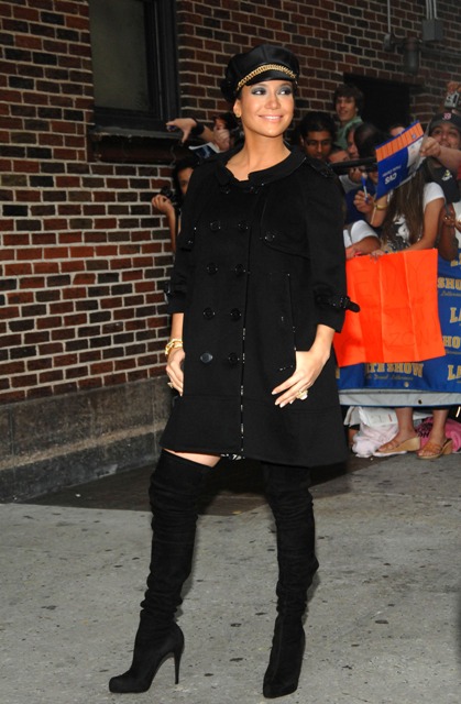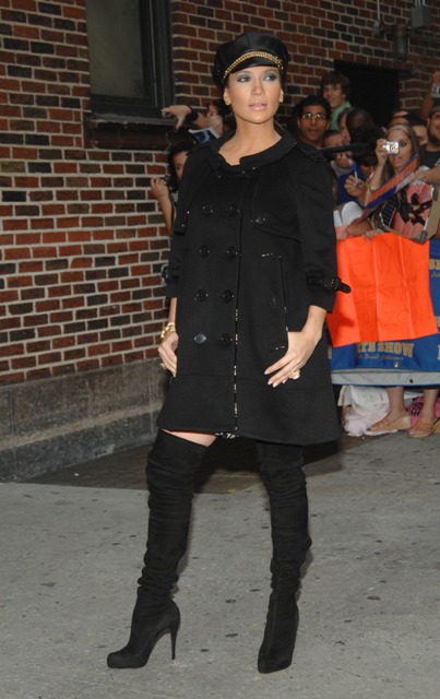 Check out Jennifer Lopez arriving at Letterman yesterday and then again on his couch. Seriously, did she break up with Scott Barnes again? What’s with the overkill over the eyes?