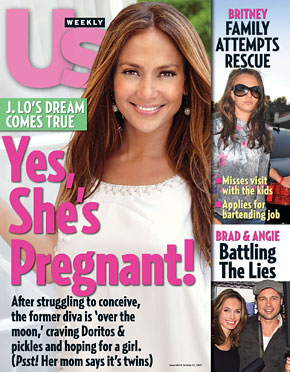 As for the main issue – while she has yet to confirm it herself, Us Weekly is proclaiming loud on their latest cover what Oribe has already known for weeks, and what many of you who know about such things had already concluded upon seeing her nose. Apparently pregnant women get chubby noses?